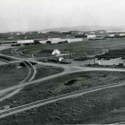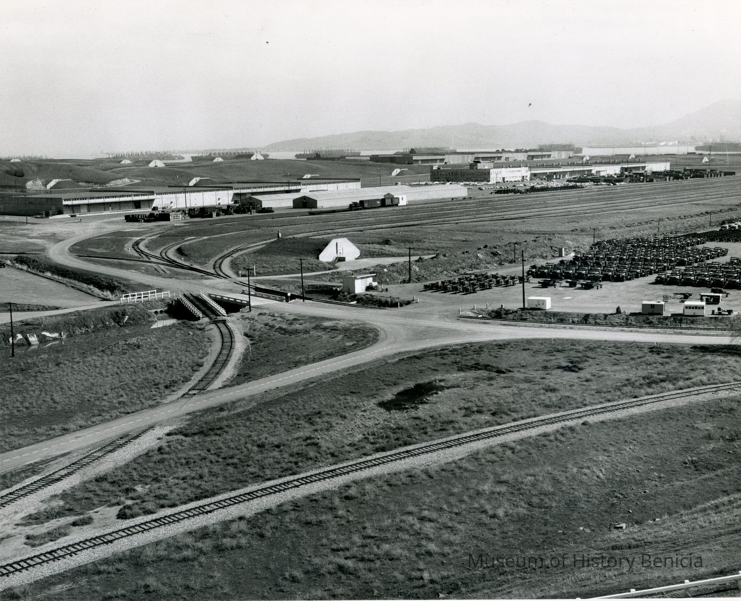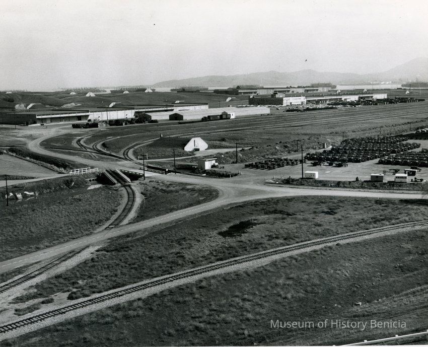 Photo from the Josephine Cowell research material. Shows a storage area and bunkers with the Carquinez Strait in the background.
