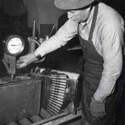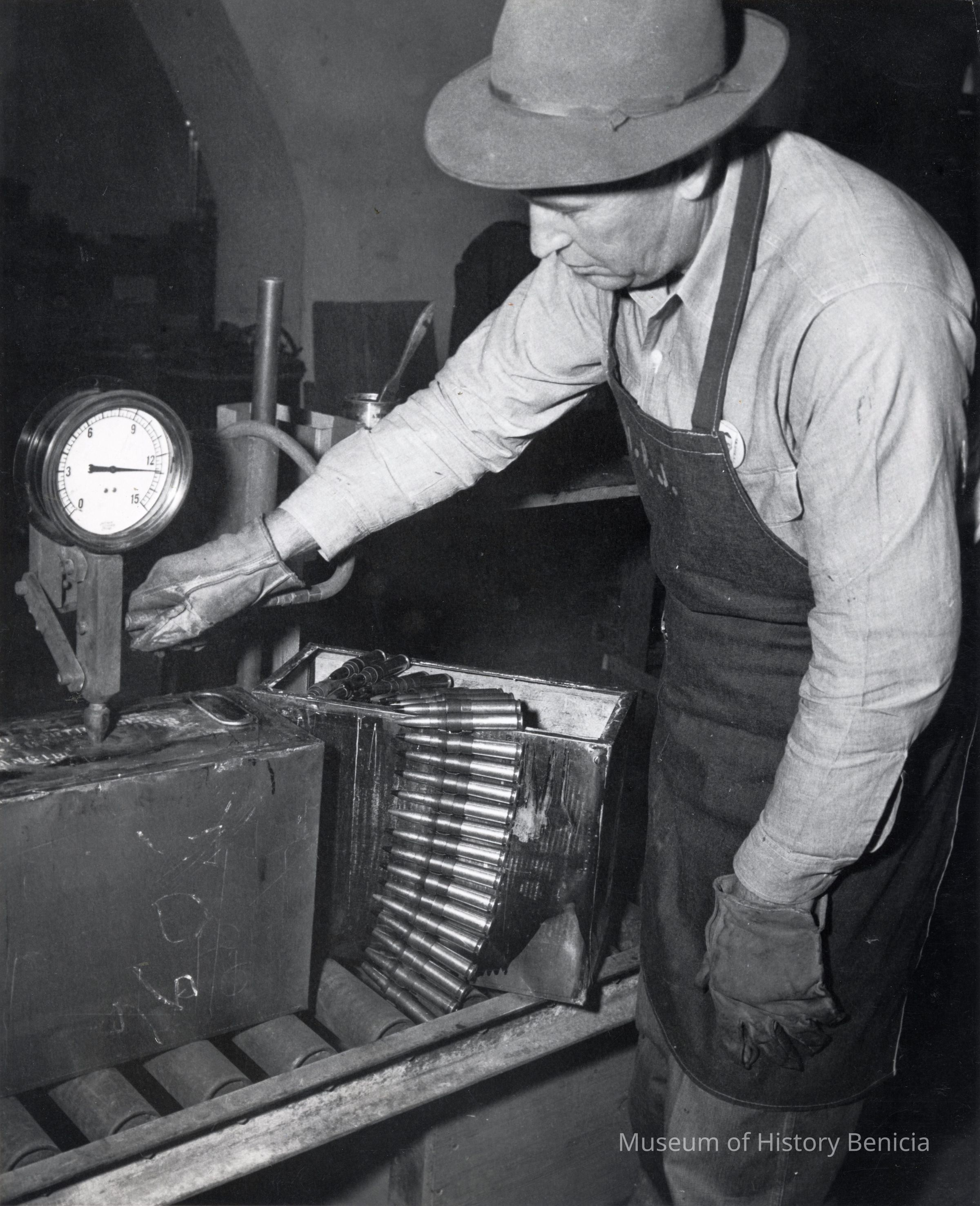 Photo from the Josephine Cowell research material. Shows Harry Johnson of the surveillance Division air testing small arms packing box of 50 caliber link ammunition.Collection