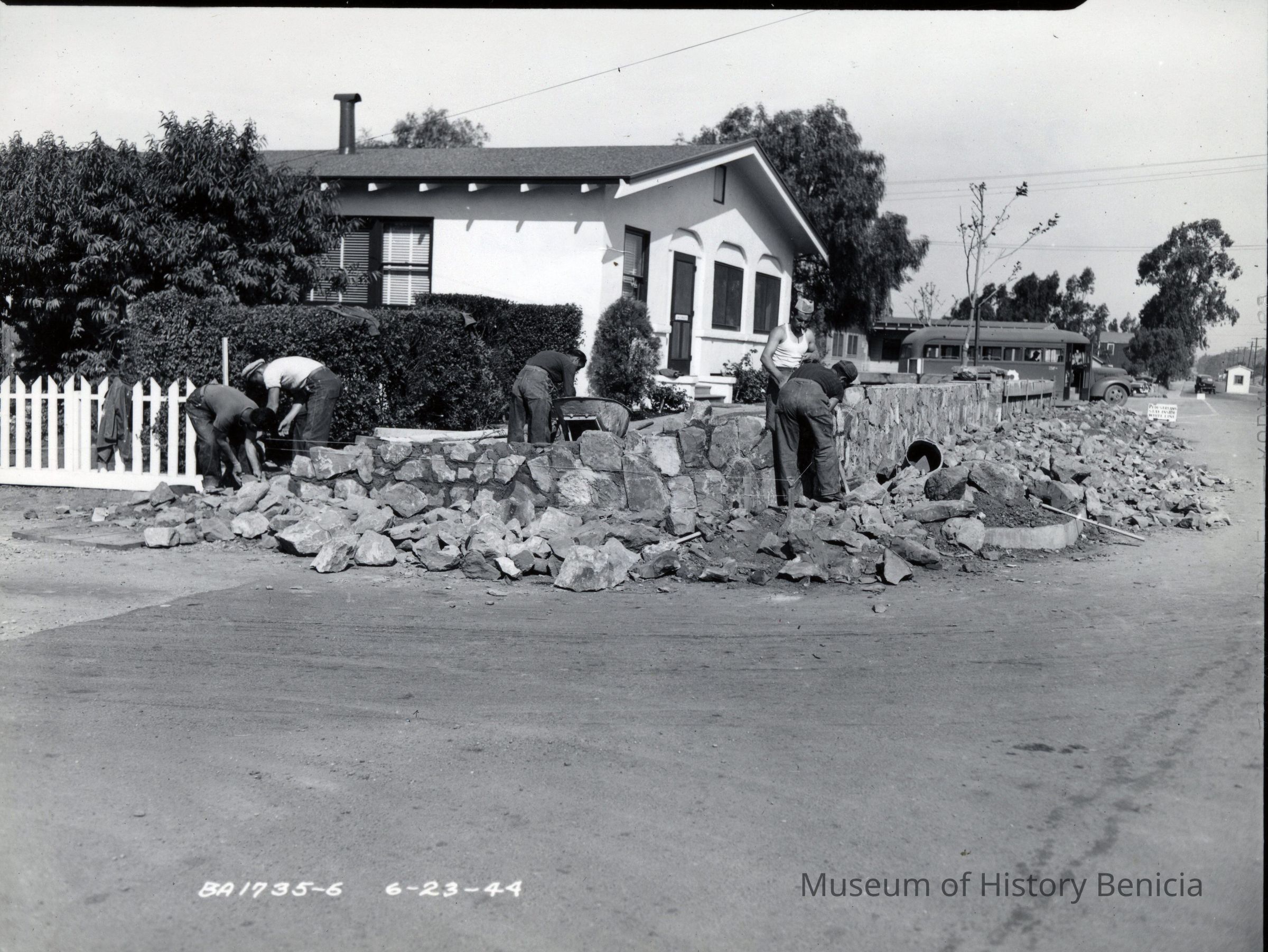 Photo from the Josephine Cowell research material. Shows Italian Service Unit members erecting stone walls in Arsenal quarters area.Collection