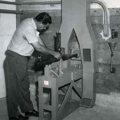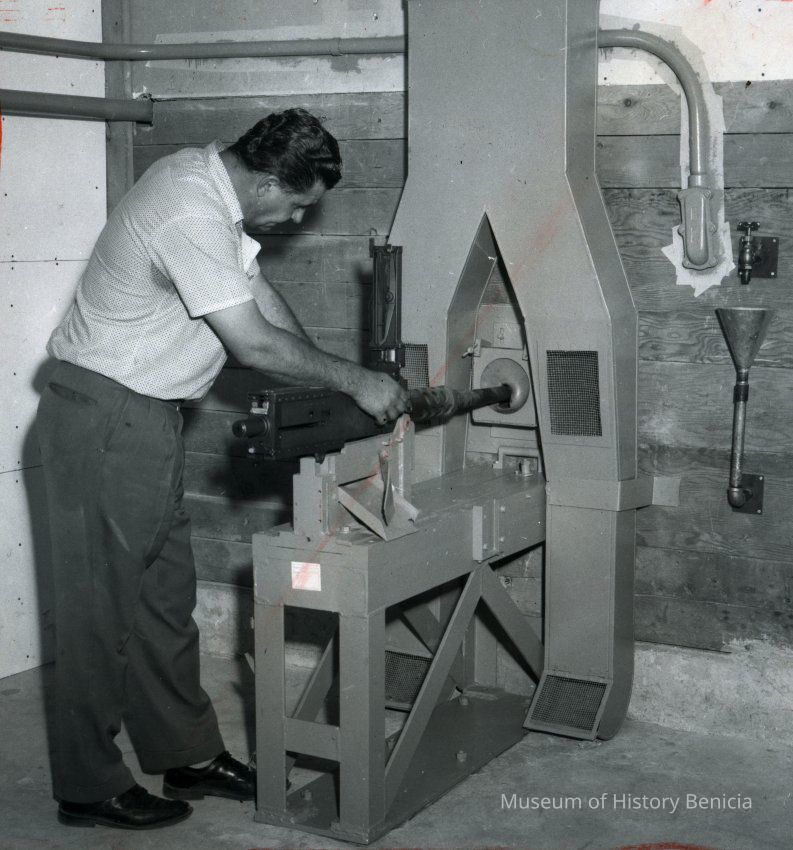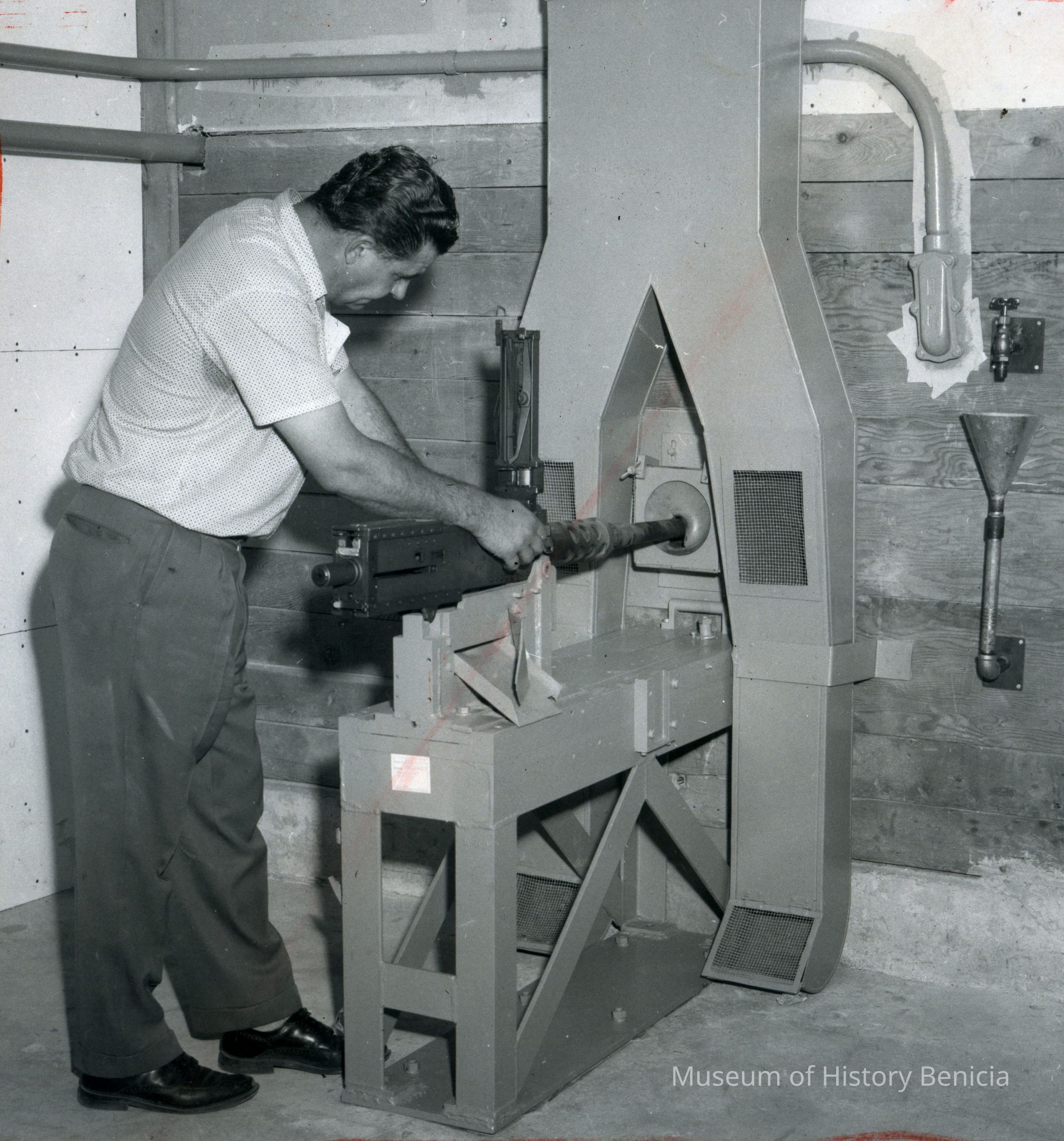 Photo from the Josephine Cowell research material. Shows machine gun being test fired. Photo was used in a newspaper as seen by cropping marks on the photo.Collection