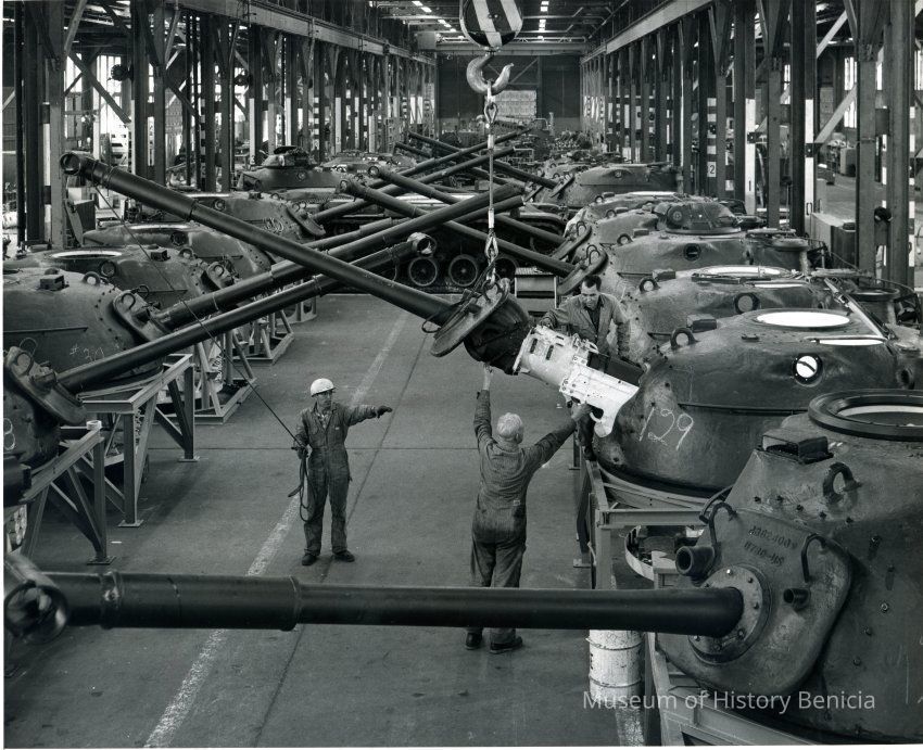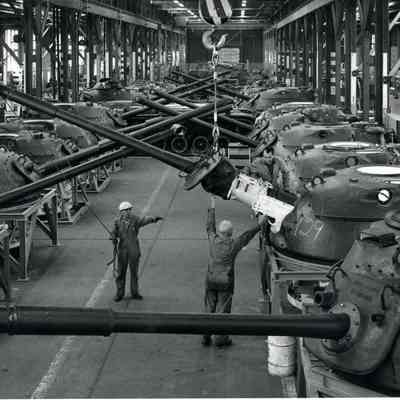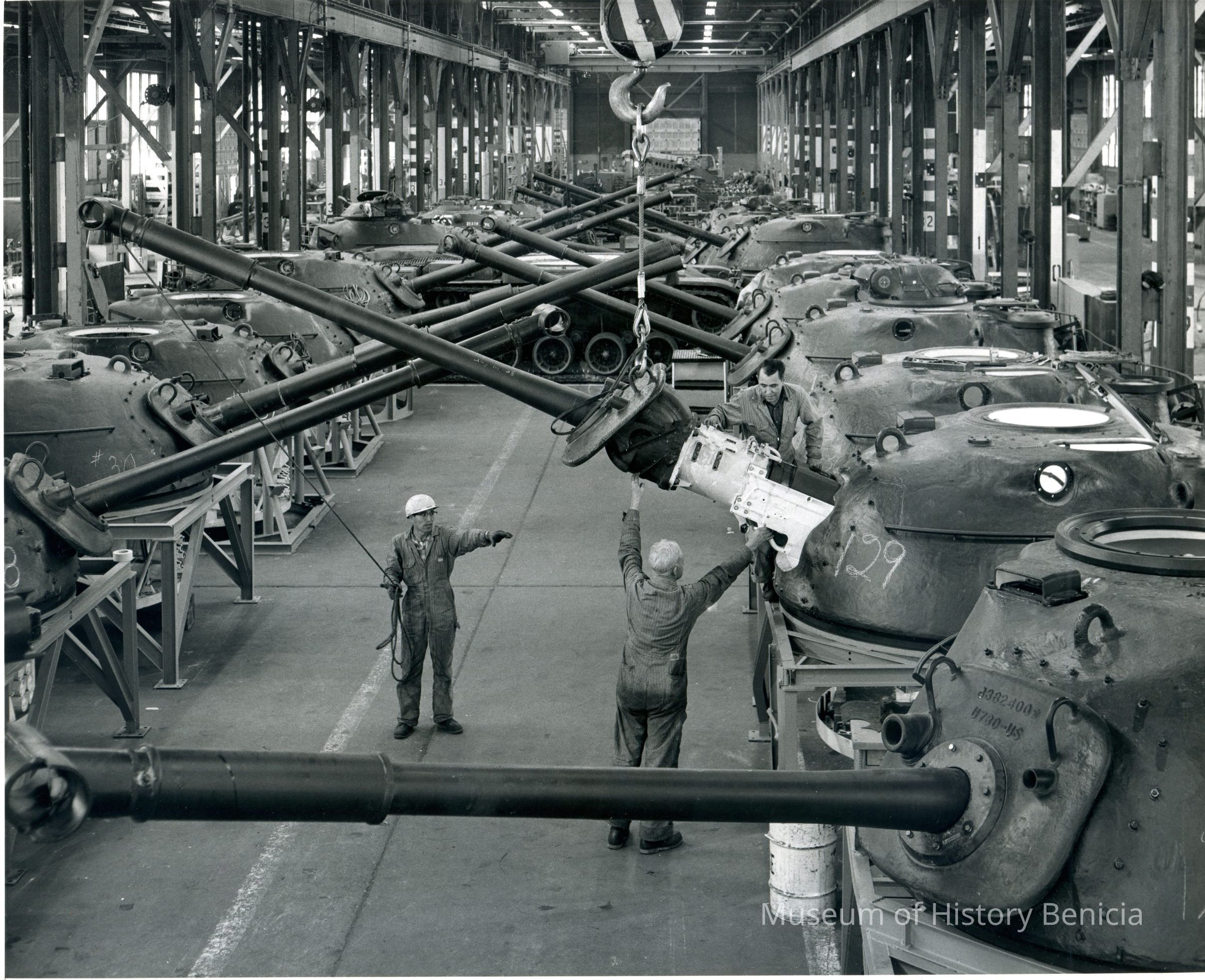 Photo from the Josephine Cowell research material. Shows tank turrets being repaired.