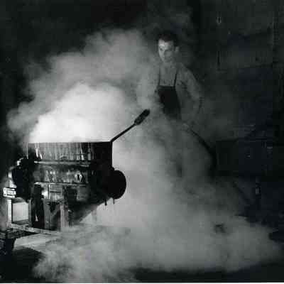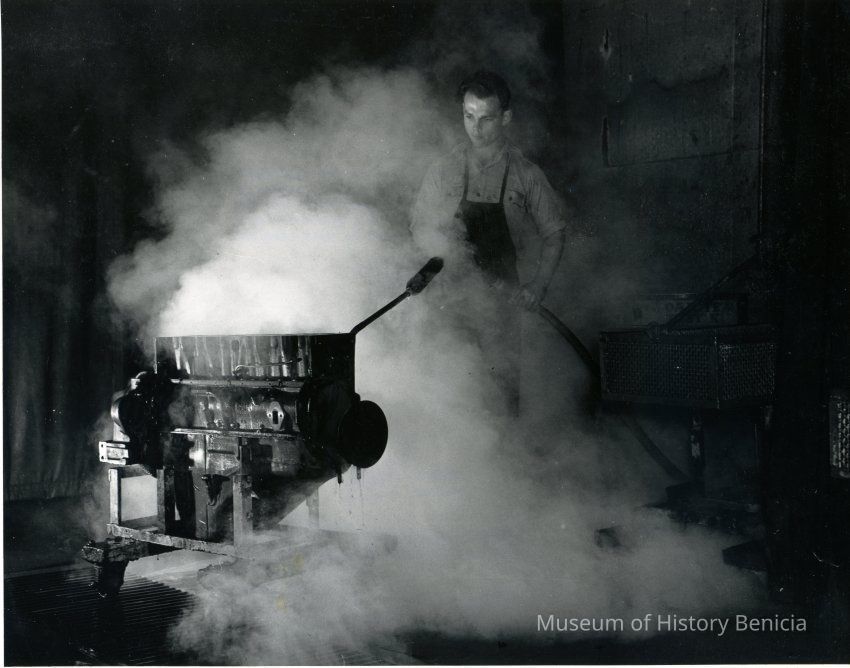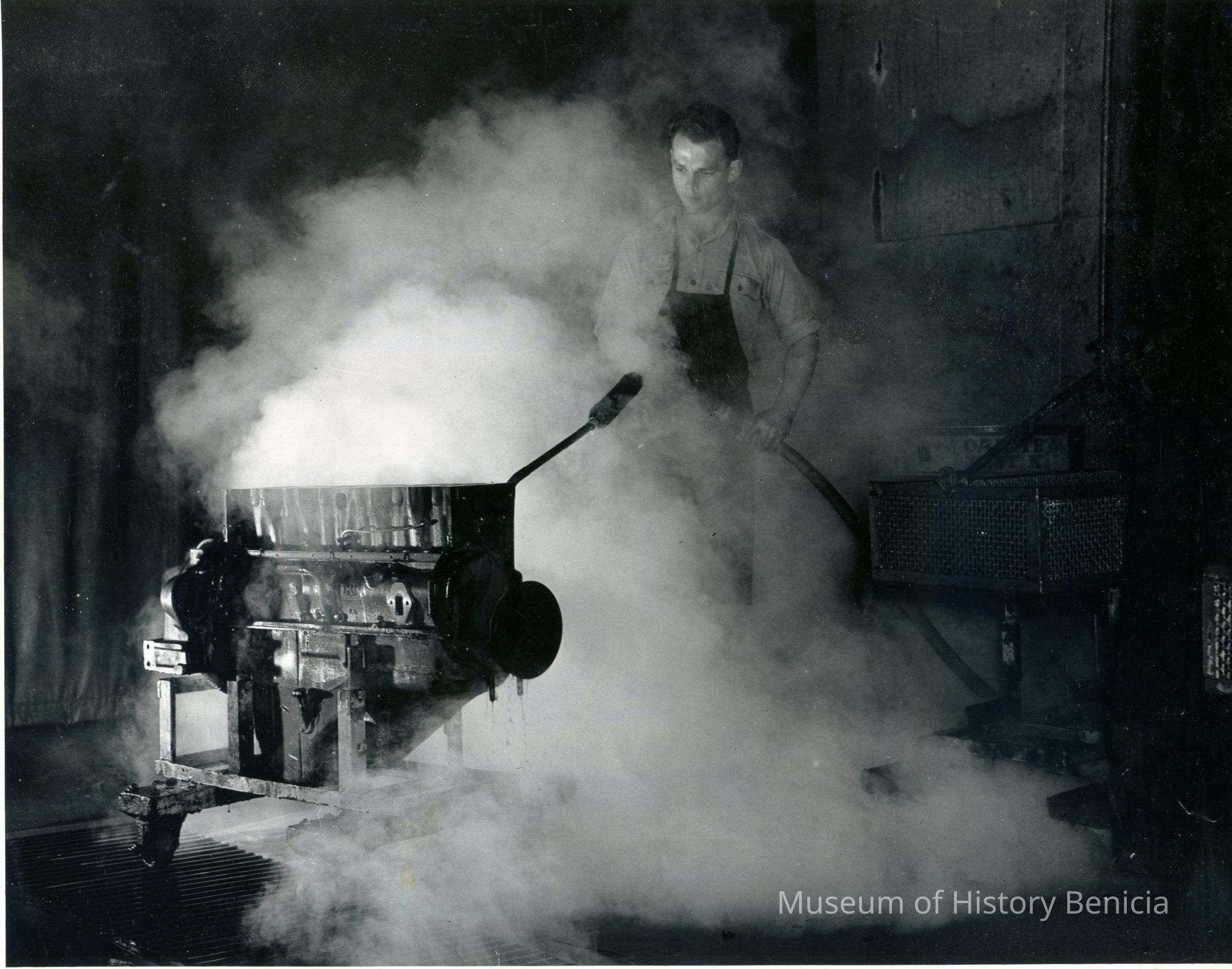 Photo from the Josephine Cowell research material. Shows David H. Macke steam cleaning engine prior to disassembly and rebuilding in Arsenal engine rebuild shop.Collection