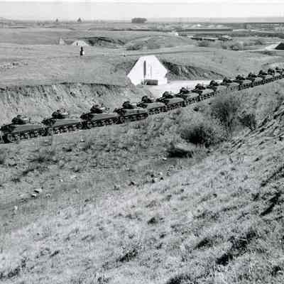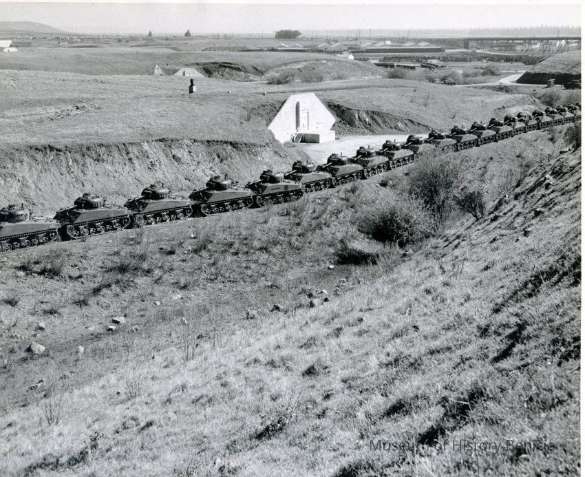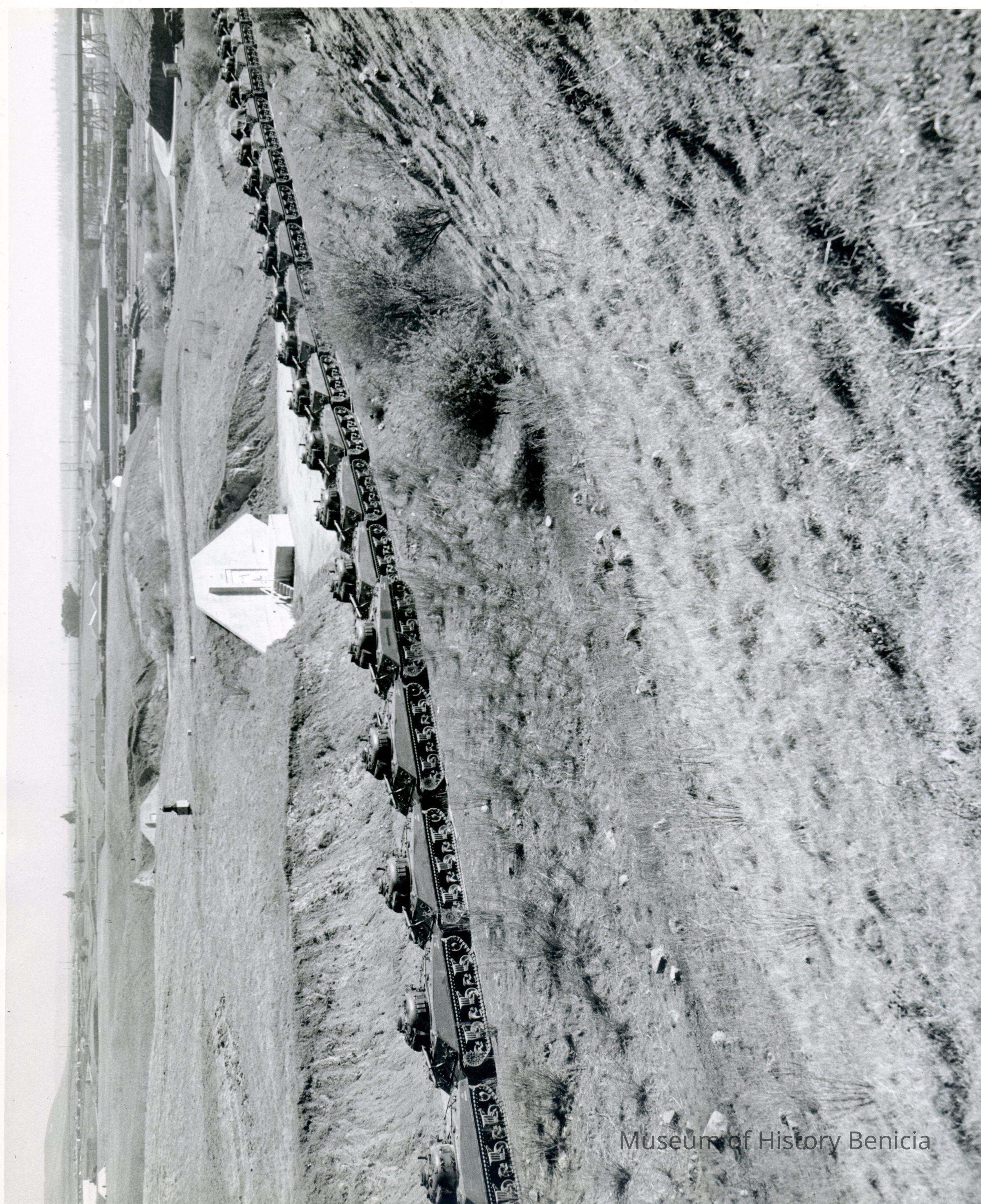 Photo from the Josephine Cowell research material. Shows a bunker and a line of tanks.