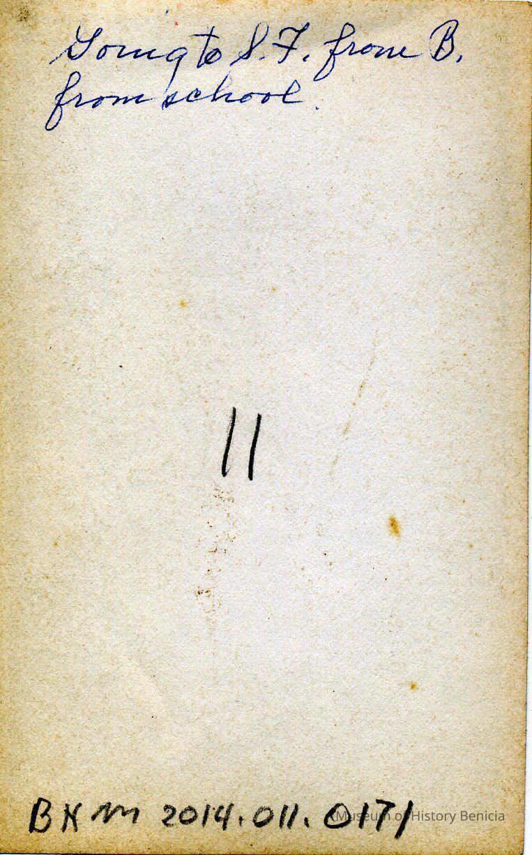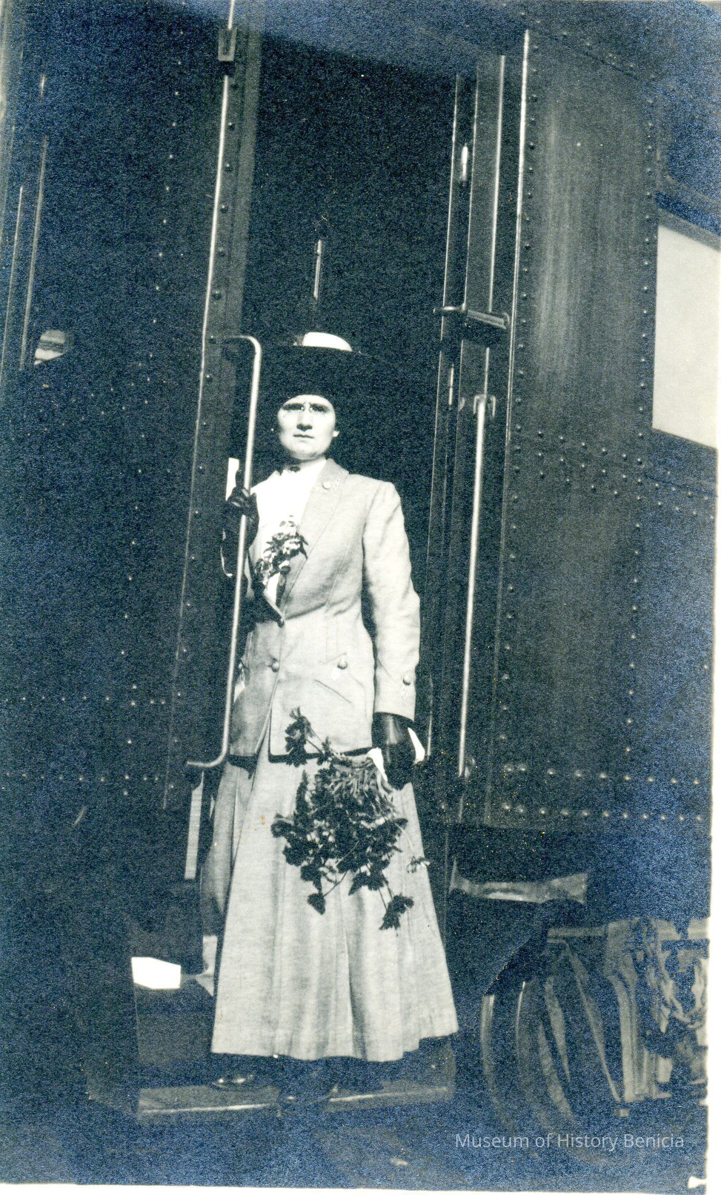 The photo is of a woman getting on the train. The back says "Going to S.F. from B from school". This could be the Miss Vira A Parker who taught in Benicia but commuted to San Francisco.Collection