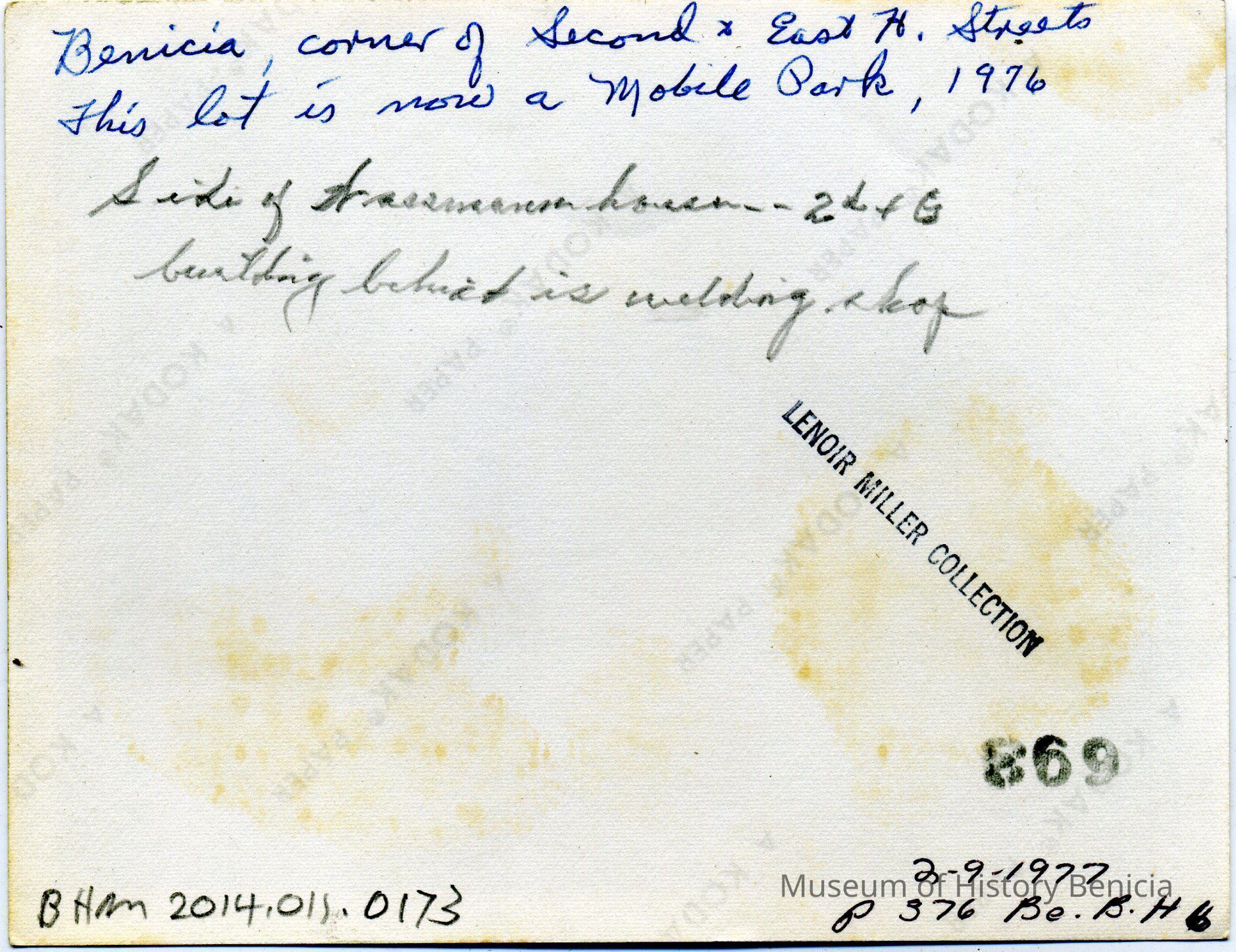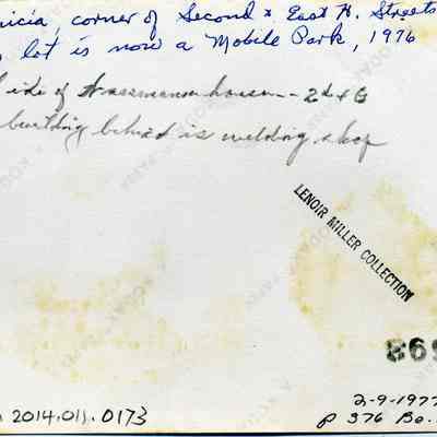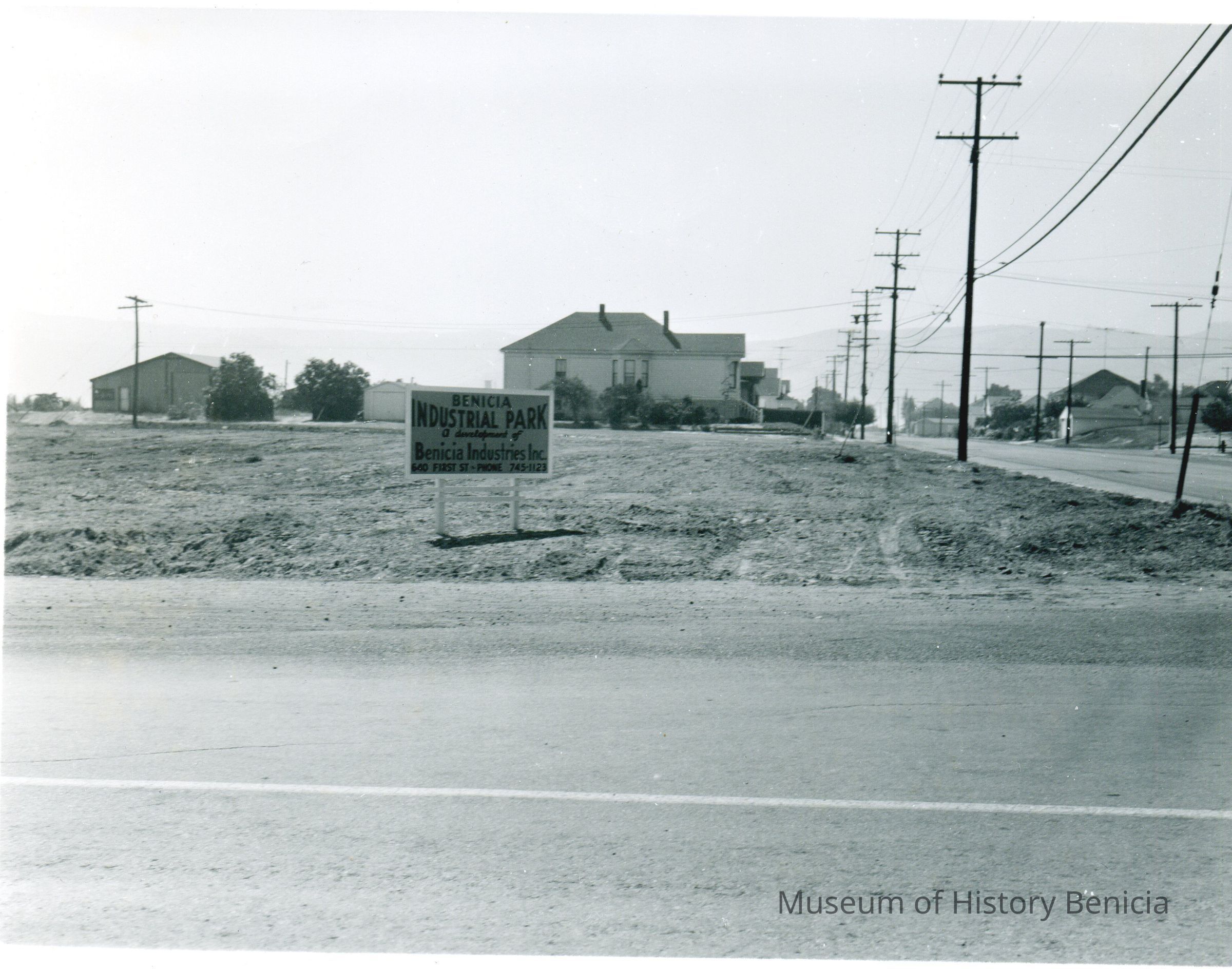 The photo is of Benicia at the corner of Second and East "H" streets. There is an empty lot with a sign in front that says "Benicia Industrial Park" and in the background is the Wassmann house. The building behind the house is a welding shop.Collection
