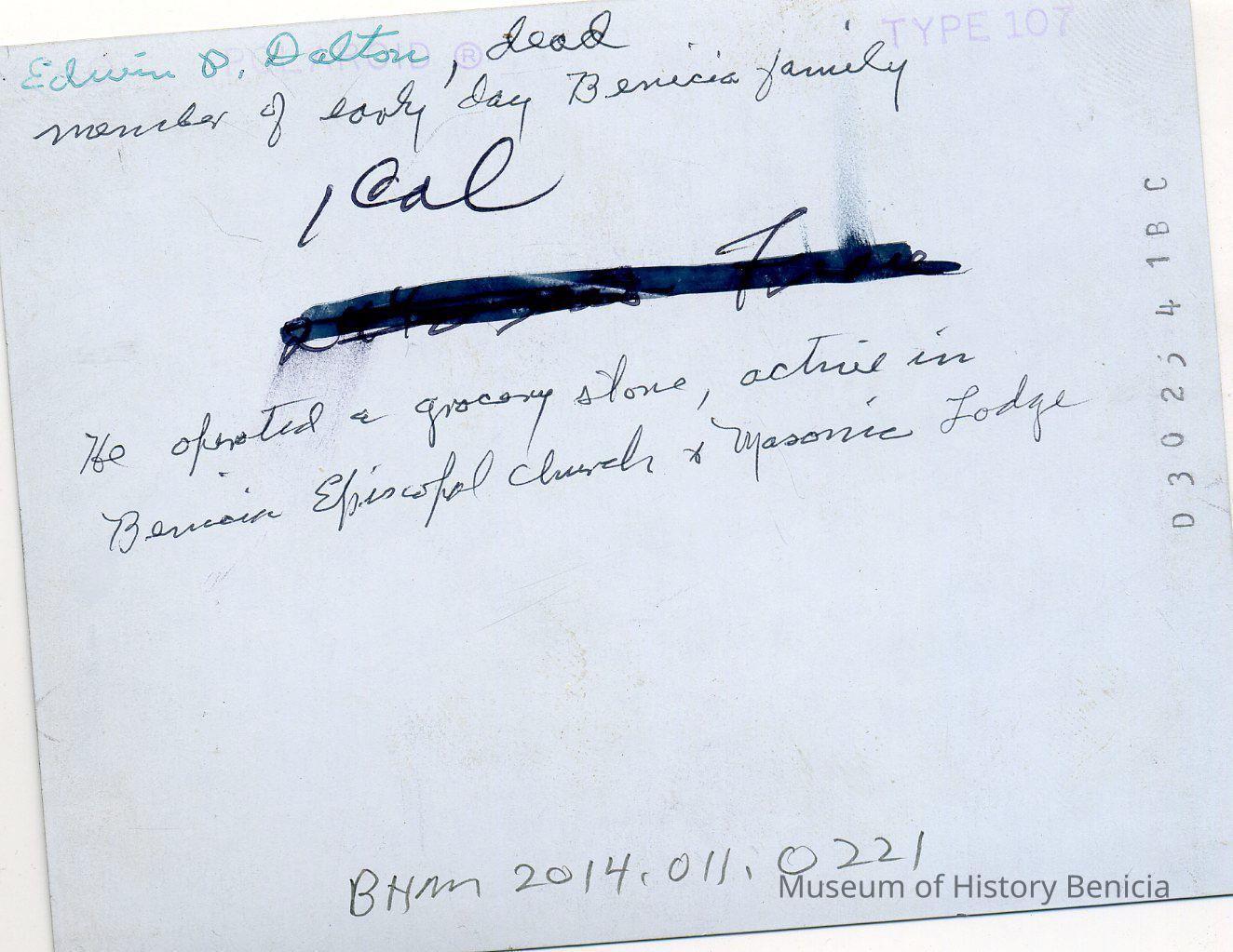 This is a photo of Edwin P Dalton, he was a member of an early day Benicia family. He operated a grocery store, was active in Benicia Episcopal Church and Masonic Lodge.