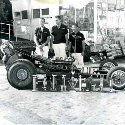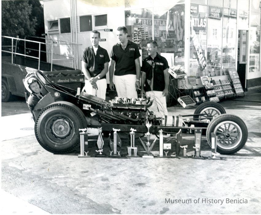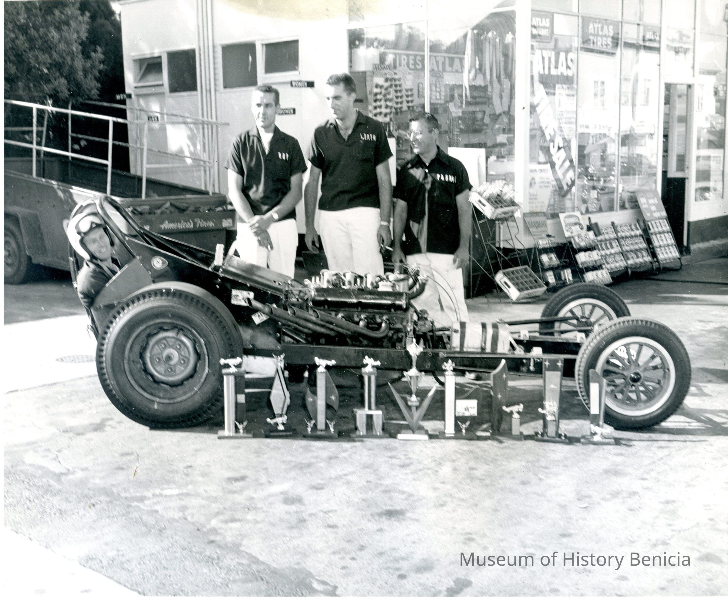 This is a photo of Benicia Racing Team in front of a gas station. Shown are three men and a bunch of trophies lined up next to a racing car.Collection