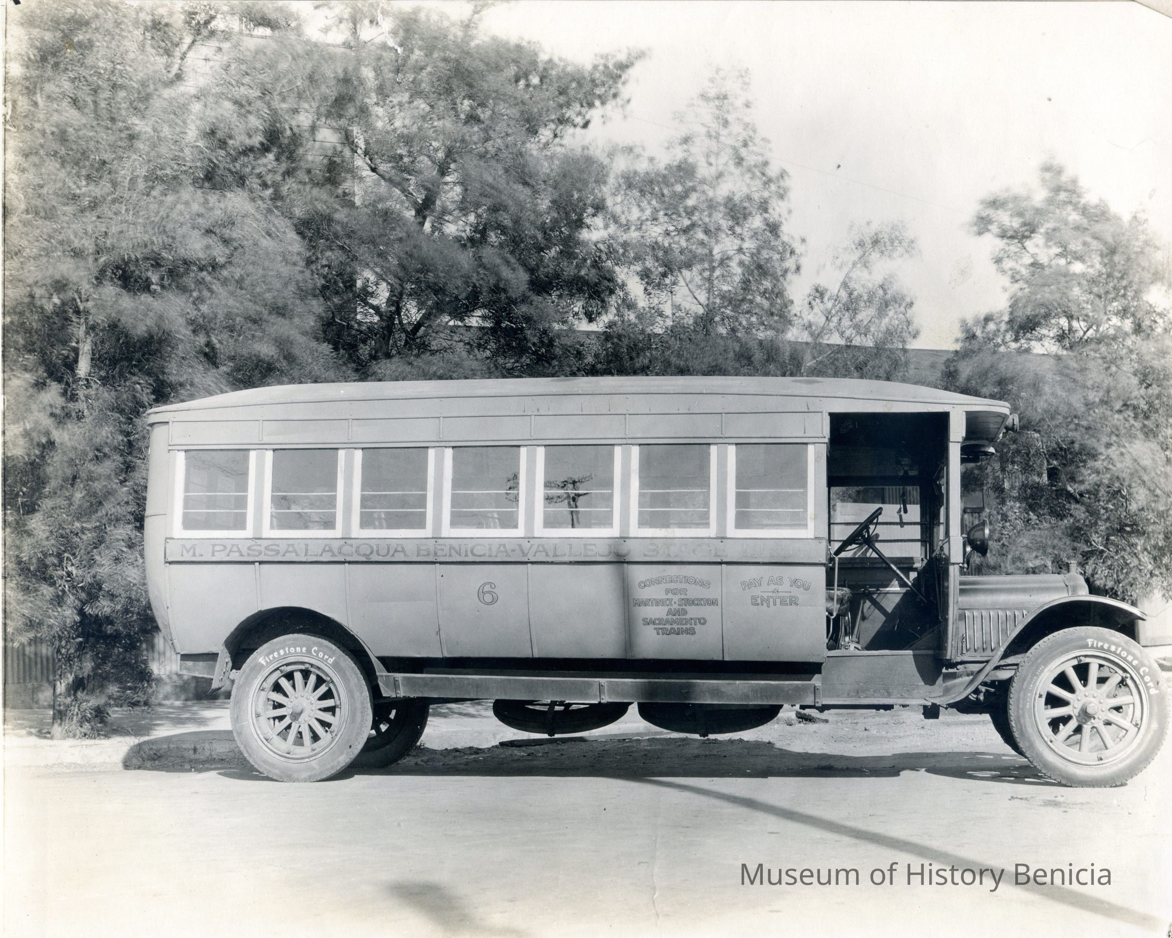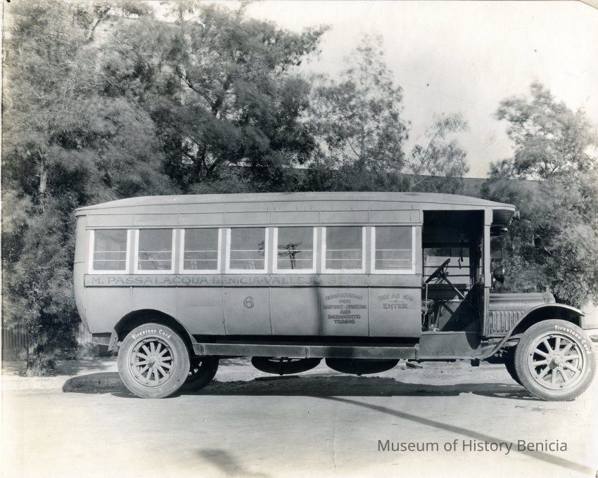 This is a photo of the M. (Milo) Passalacqua Benicia-Vallejo Stage. It is an old bus.