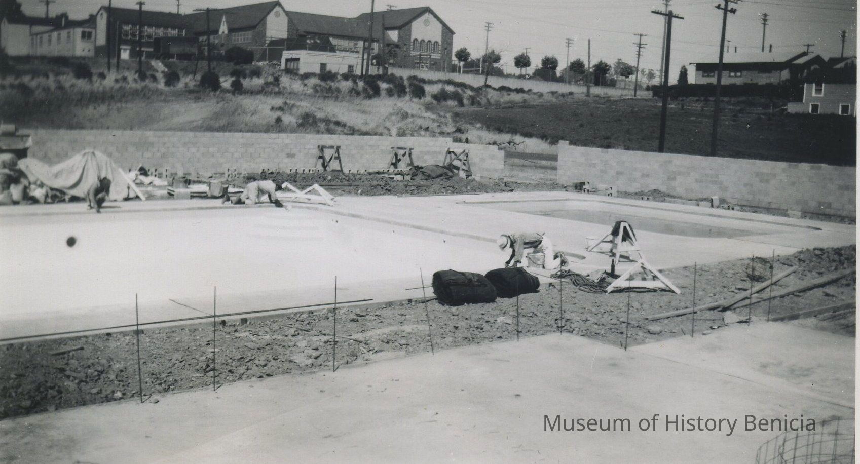 B/W Photograph - Construction of first city swimming pool, showing the shallow end of the main pool and the wading pool mid 1940's;