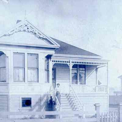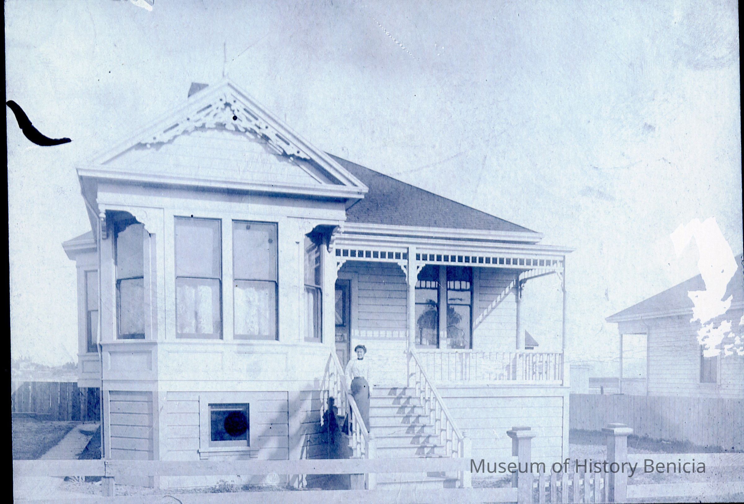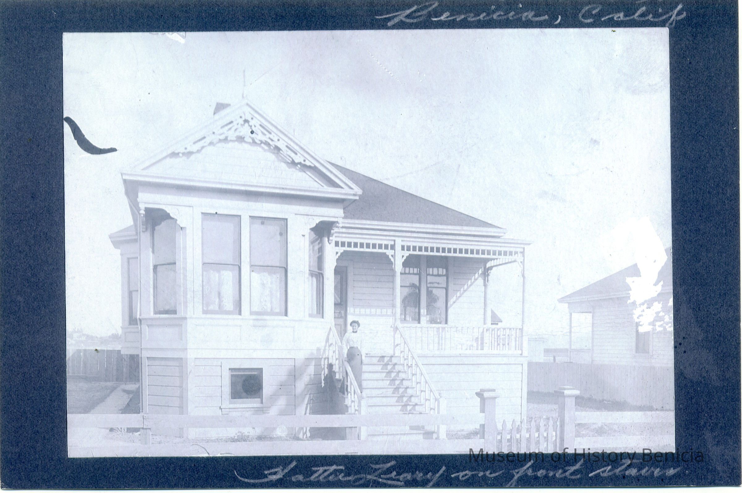 This is a copy photo of the Wassmann house at 640 E Second. The woman on the steps is identified as Hattie Leary.
