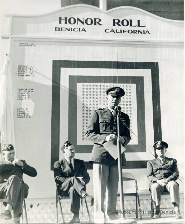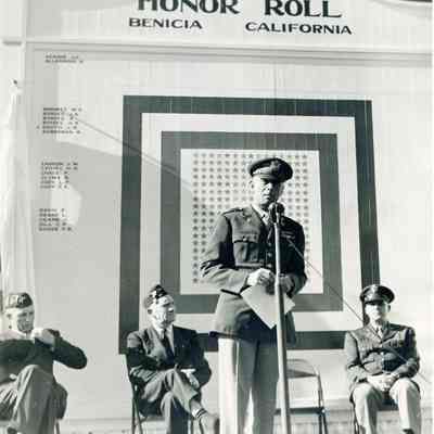 Photo of military and civilians making speeches in front of the Benicia, CA Honor Roll. Seems to be an honor roll of people serving in World War II.Collection