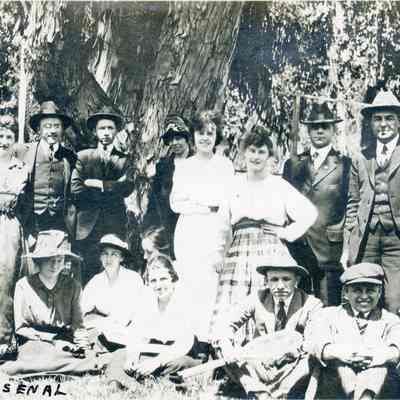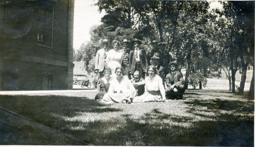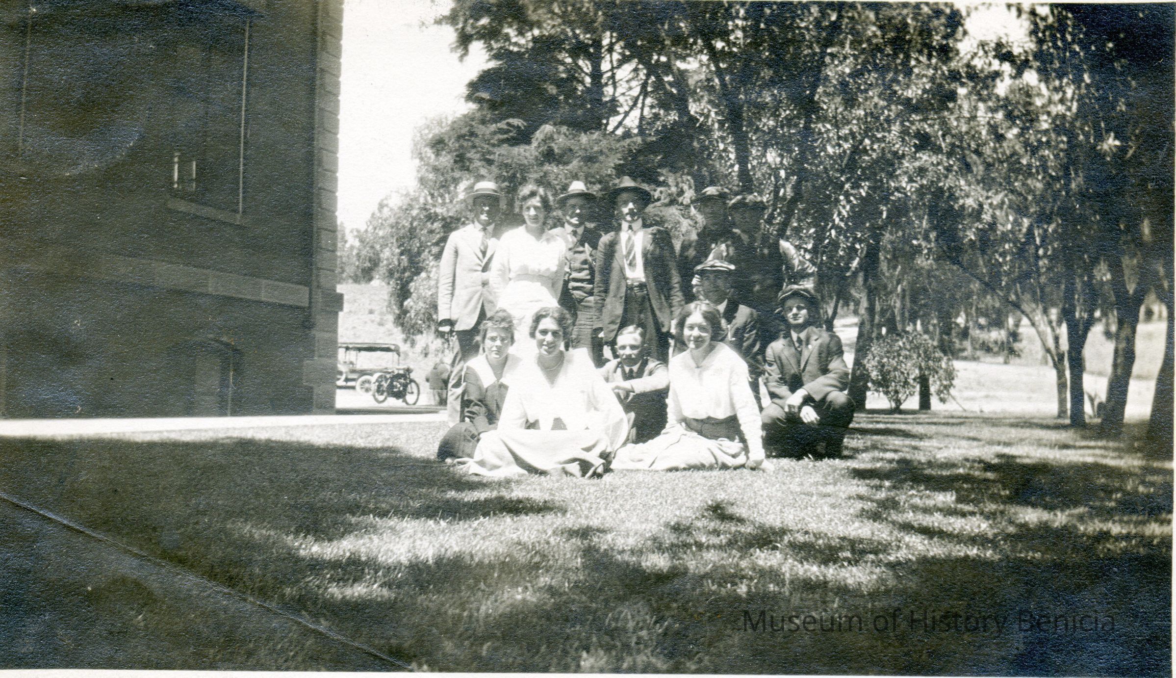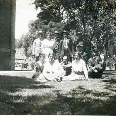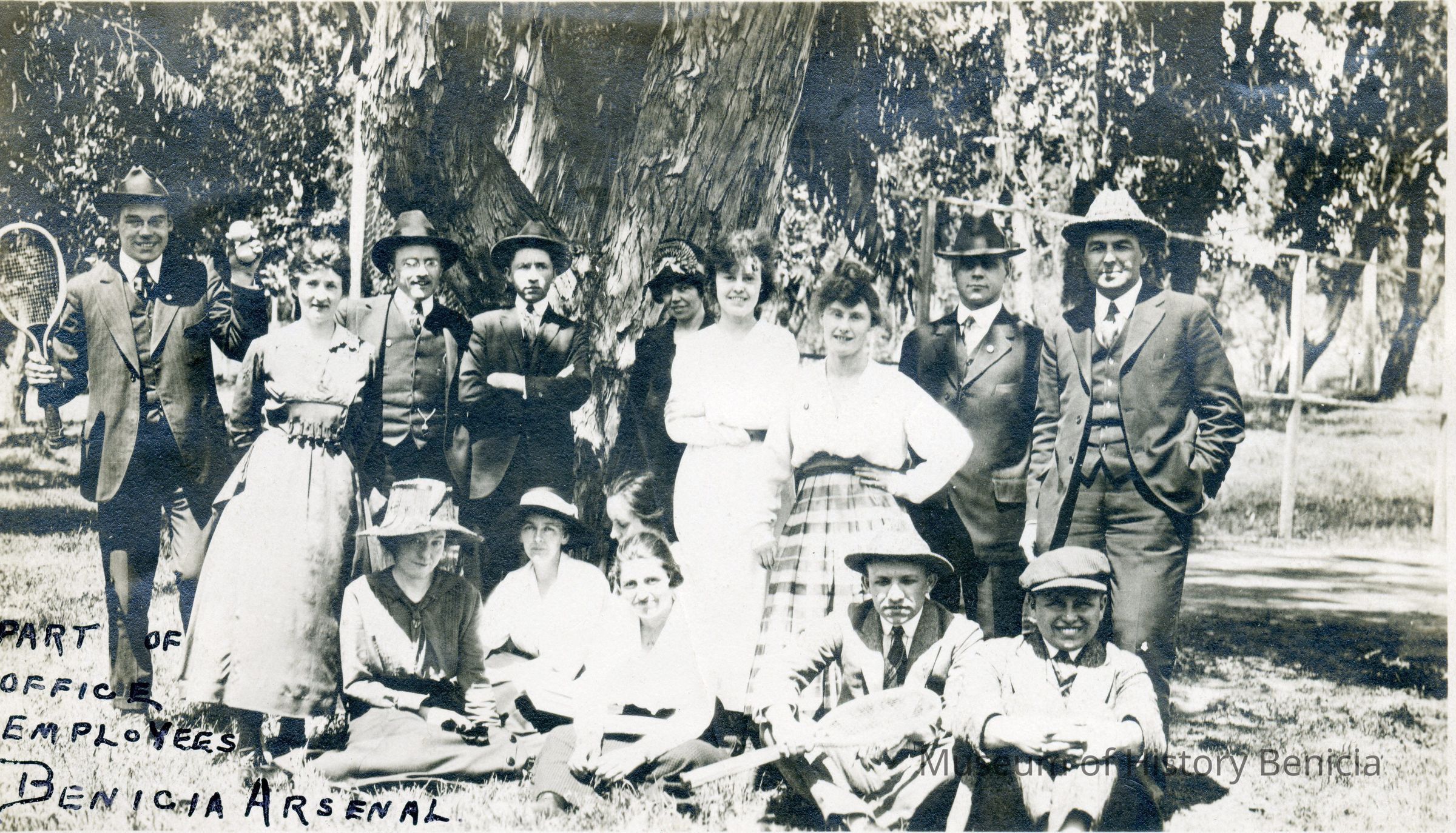"A" - "Part of office employees Benicia Arsenal. Taken outdoors, maybe at the city park. One man is holding a racquett and there is a net in the background.