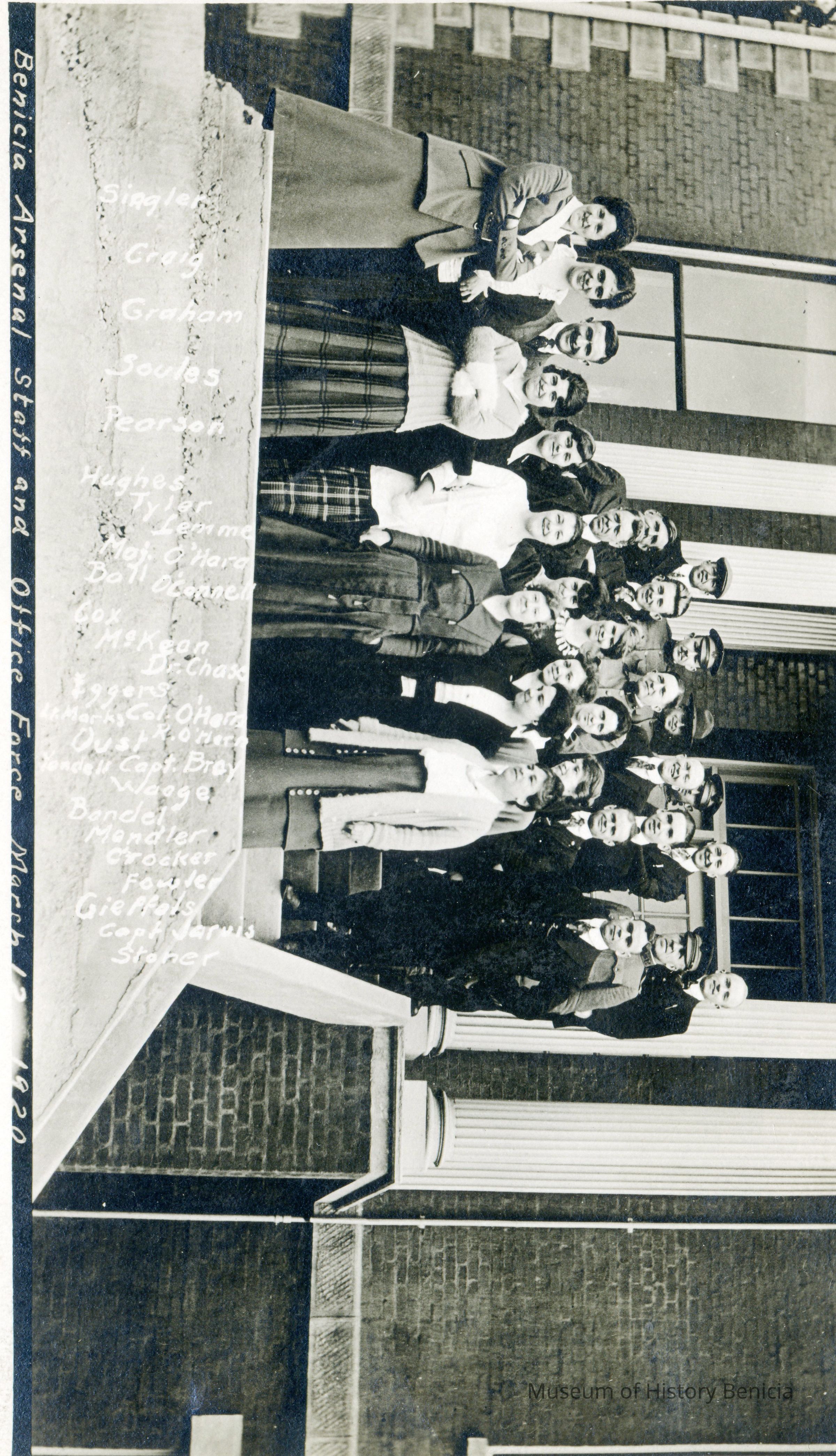 One of several photos taken from the Stoner family album. Most of the photos are of class photos taken at various grade levels in Benicia. This page is of staff that worked at the Arsenal on March 20, 1920. There are 4 photos glued to a photo album page. They are: