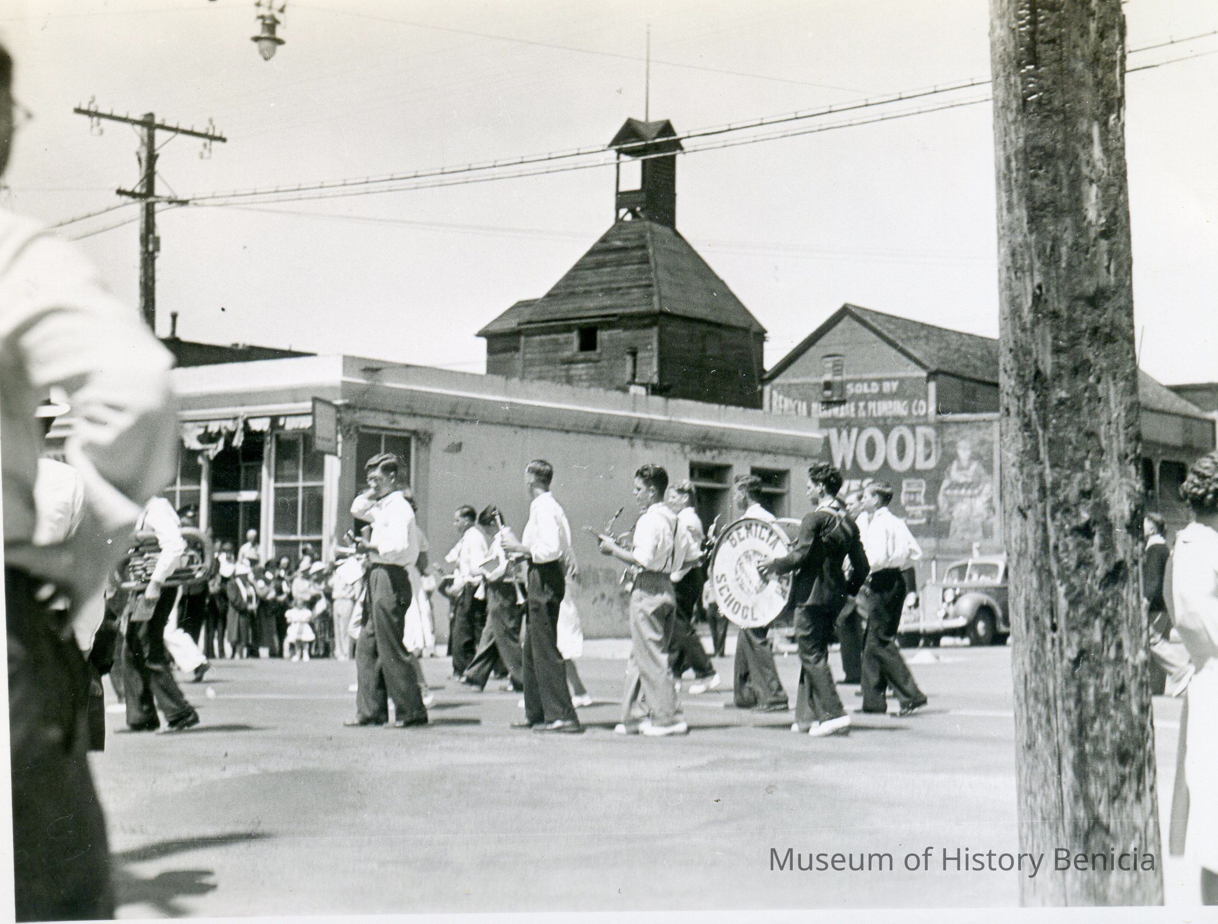 This is a photo of the Benicia High School band in a parade on First street.