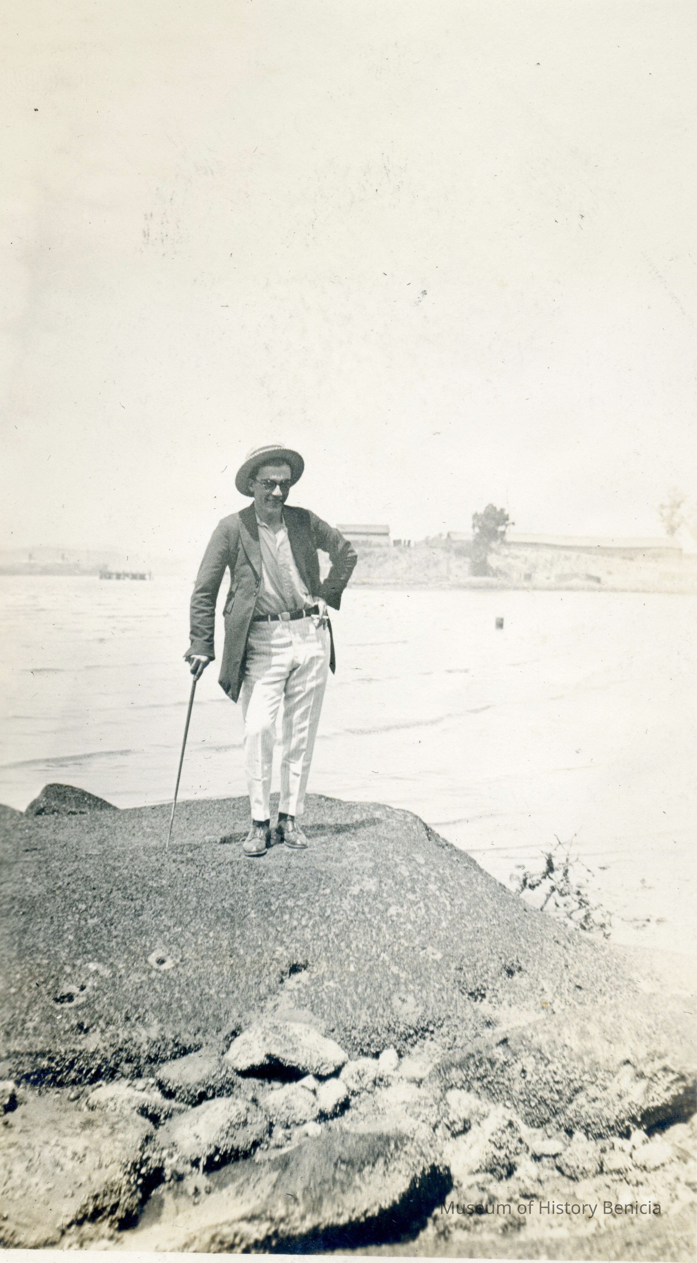 This photo shows a man standing on the rocks by Benicia. In the background is Dillon Point. The man has a cane and is wearing a straw hat.Collection