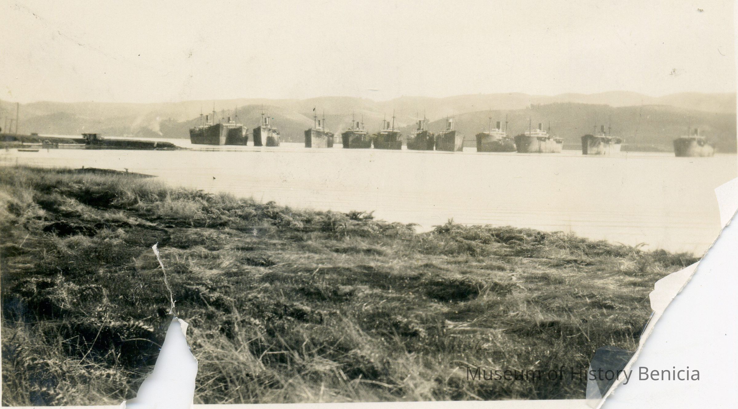 This photo appears to be a photo that was used in the newspaper. It shows the ships that were kept at Southampton Bay prior to the establishment of the current mothball fleet.Collection