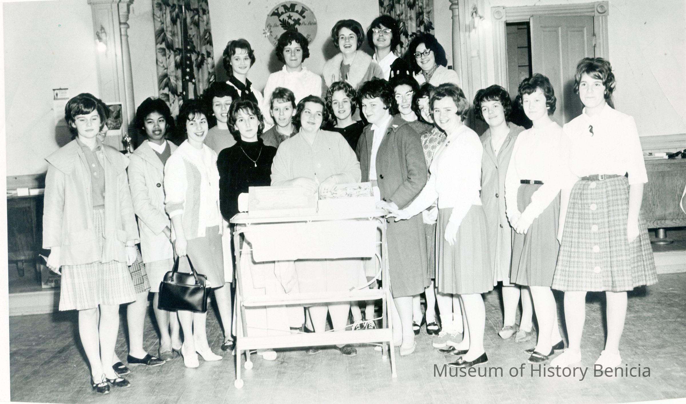 This photo appears to be a photo that was used in the newspaper. It shows a group of young women in a hall with a "Y.M.I." sign in the background. YMI stands for Young Men's Institute. These young women are members of the Junior Y.L.I. There is nothing on the back to indicate who the people are in the photo. However, the following individuals have been identified: