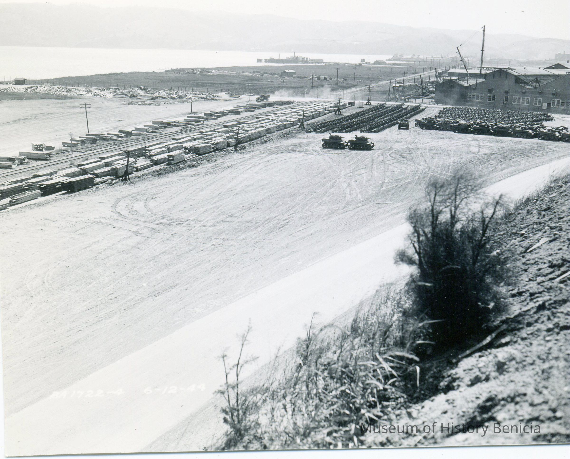 These are photos of the Benicia Arsenal at the time of WWII. They are copies of official Army photographs with the Benicia Arsenal number and date on most of them. This photo shows stacks of lumber along the railroad tracks and tanks and artillery pieces in the background.Collection