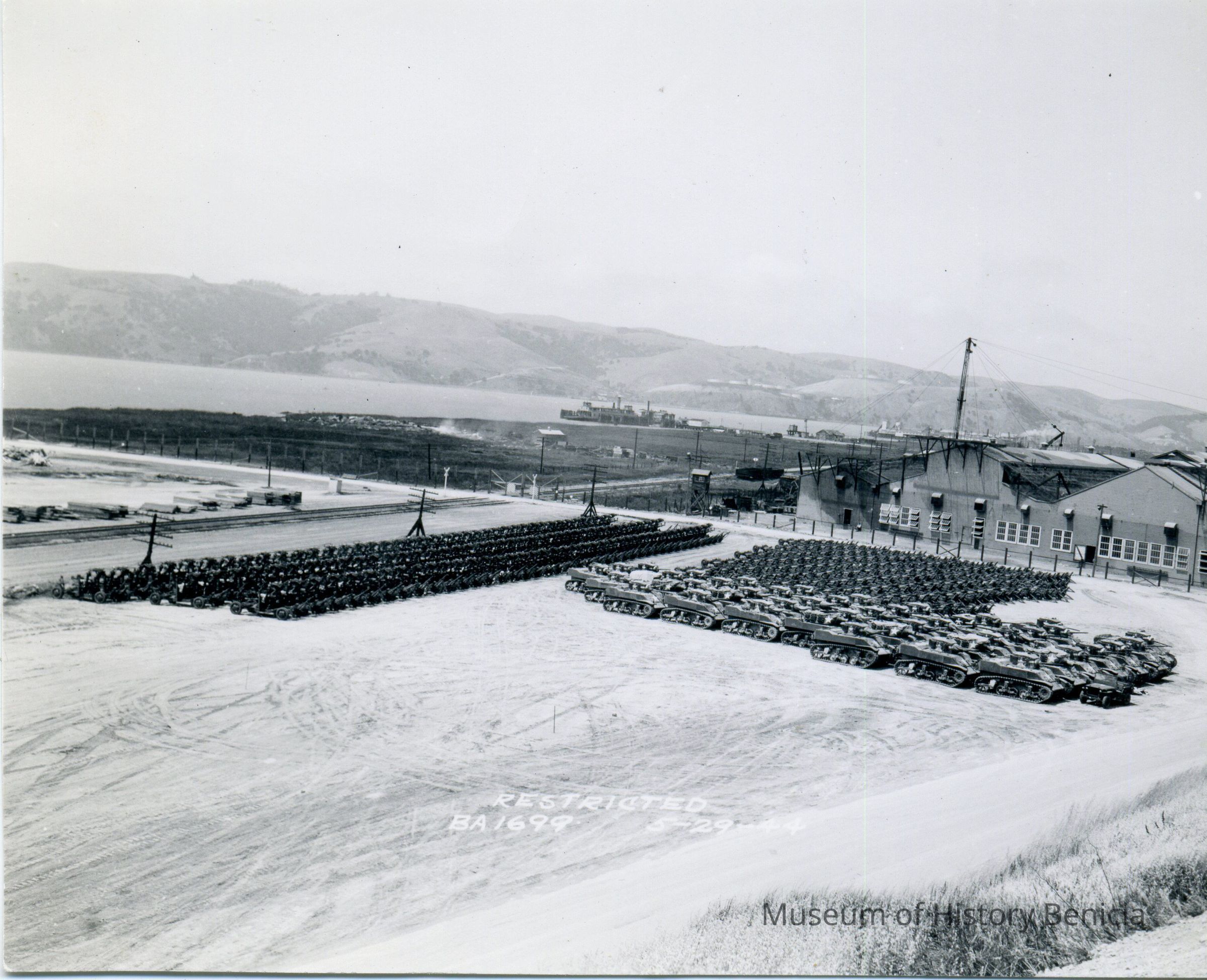 These are photos of the Benicia Arsenal at the time of WWII. They are copies of official Army photographs with the Benicia Arsenal number and date on most of them. This photo shows an area where tanks and artillery pieces are stored.Collection