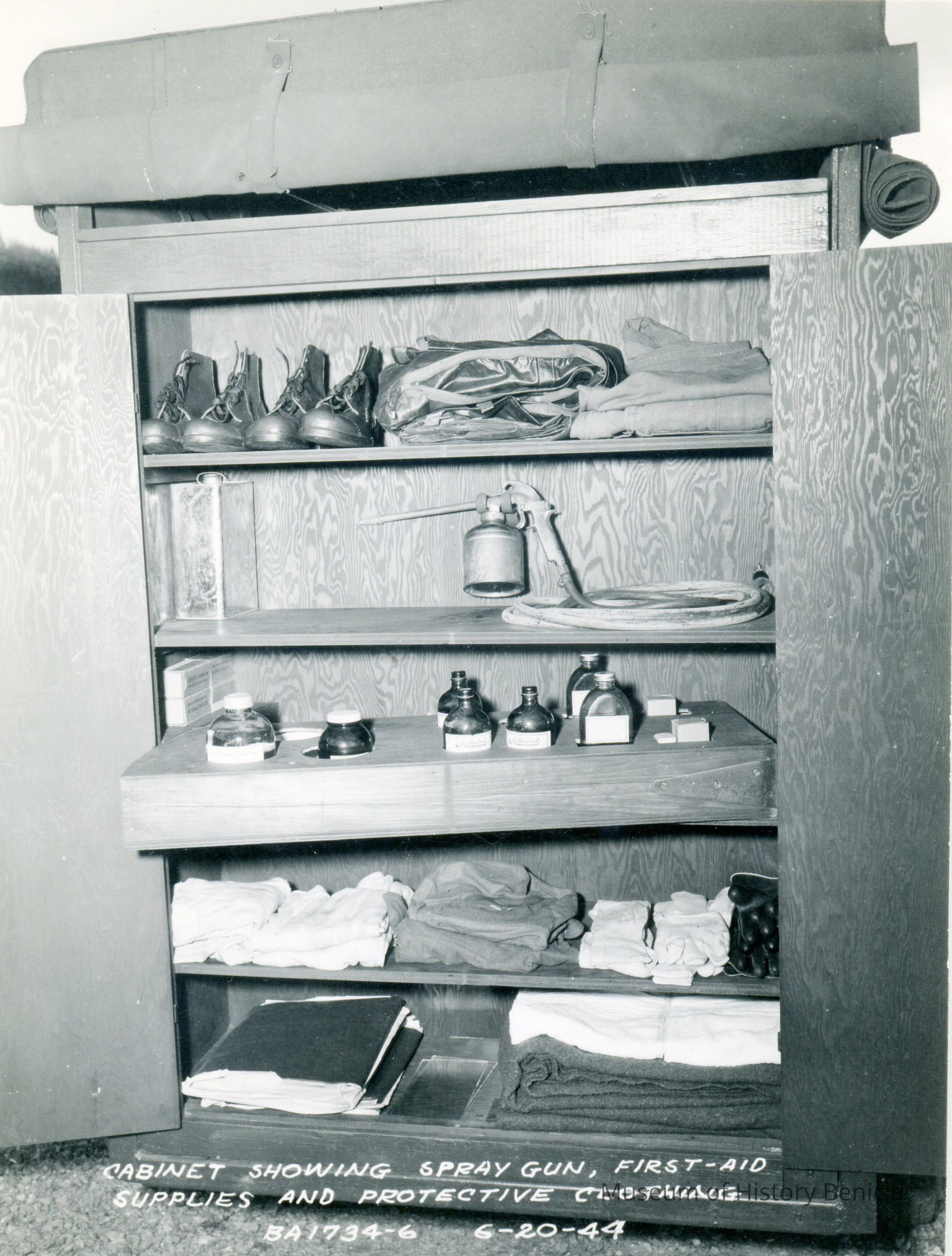 These are photos of the Benicia Arsenal at the time of WWII. They are copies of official Army photographs with the Benicia Arsenal number and date on most of them. This photo shows the inside of the first-aid cabinet in the emergency vehicle.Collection