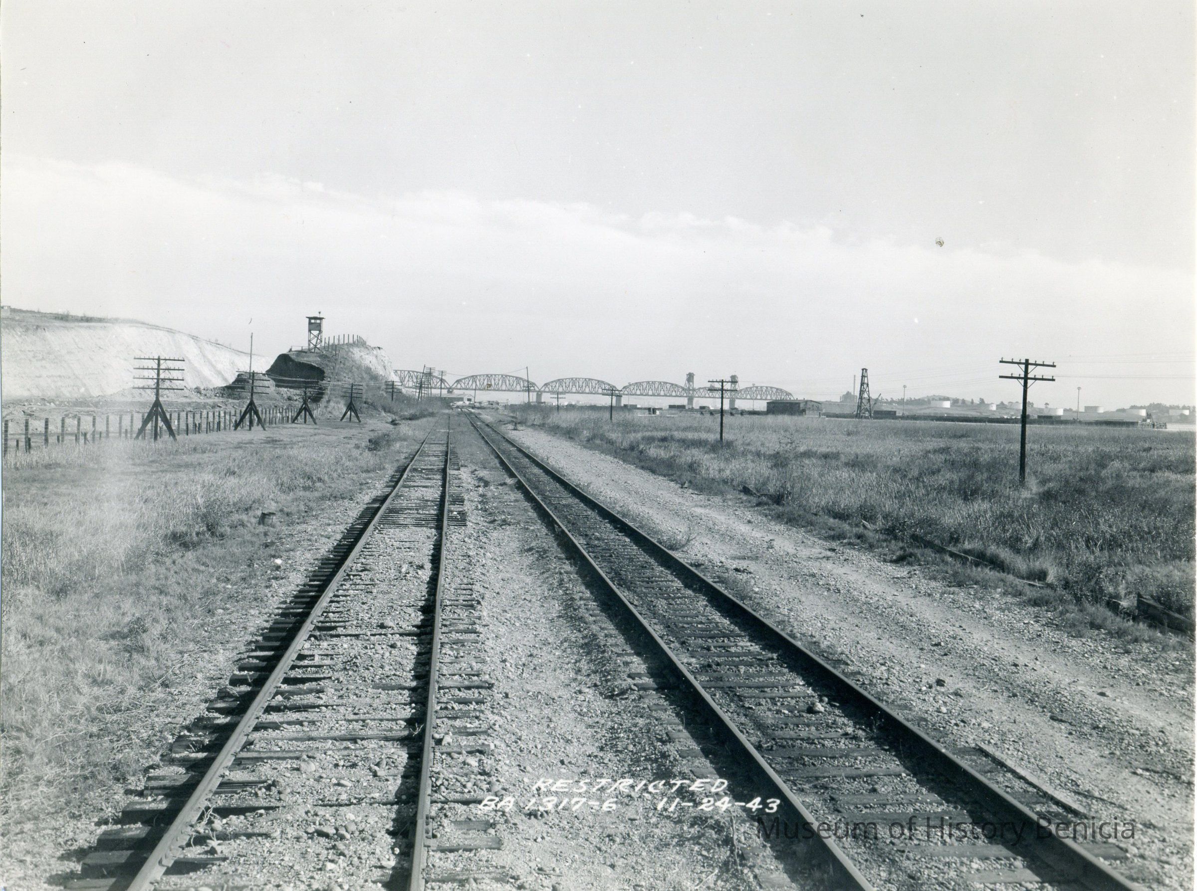 These are photos of the Benicia Arsenal at the time of WWII. They are copies of official Army photographs with the Benicia Arsenal number and date on most of them. This photo shows the railroad tracks going through the Benicia Arsenal.Collection