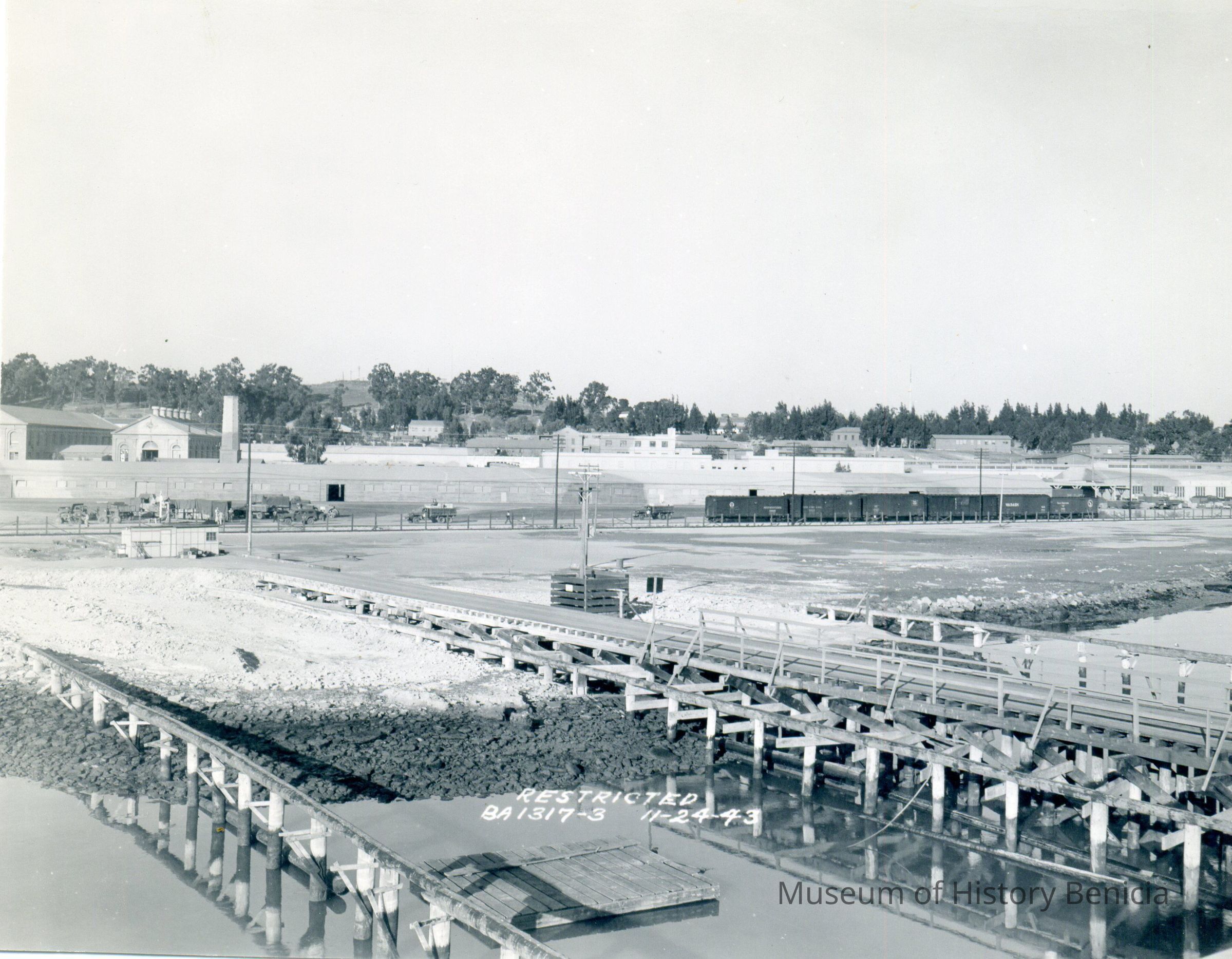 These are photos of the Benicia Arsenal at the time of WWII. They are copies of official Army photographs with the Benicia Arsenal number and date on most of them. This photo shows the Benicia Arsenal from the railroad dock.Collection