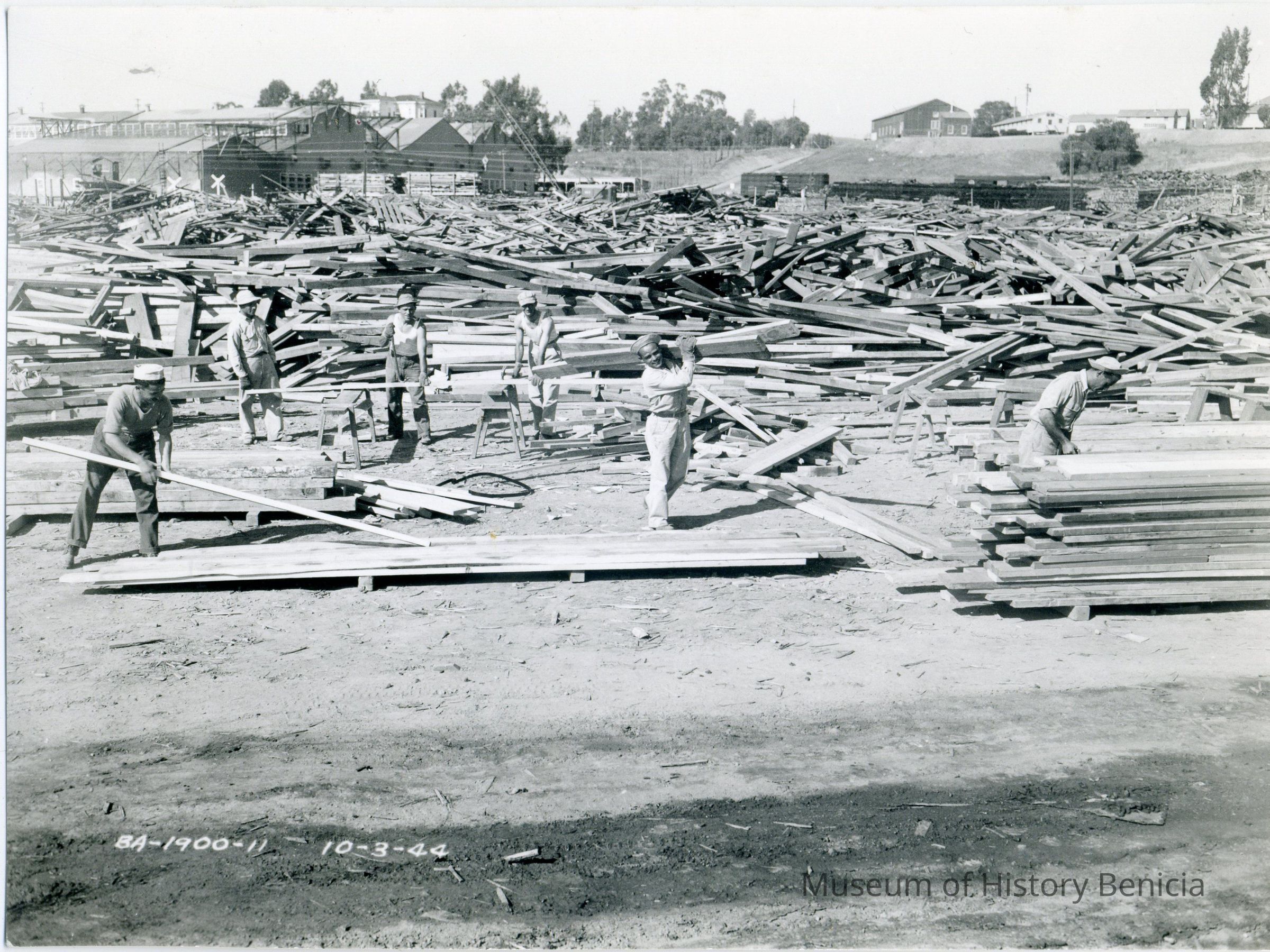 These are photos of the Benicia Arsenal at the time of WWII. They are copies of official Army photographs with the Benicia Arsenal number and date on most of them. This photo shows workers moving and sorting lumber from the Benicia Arsenal.Collection