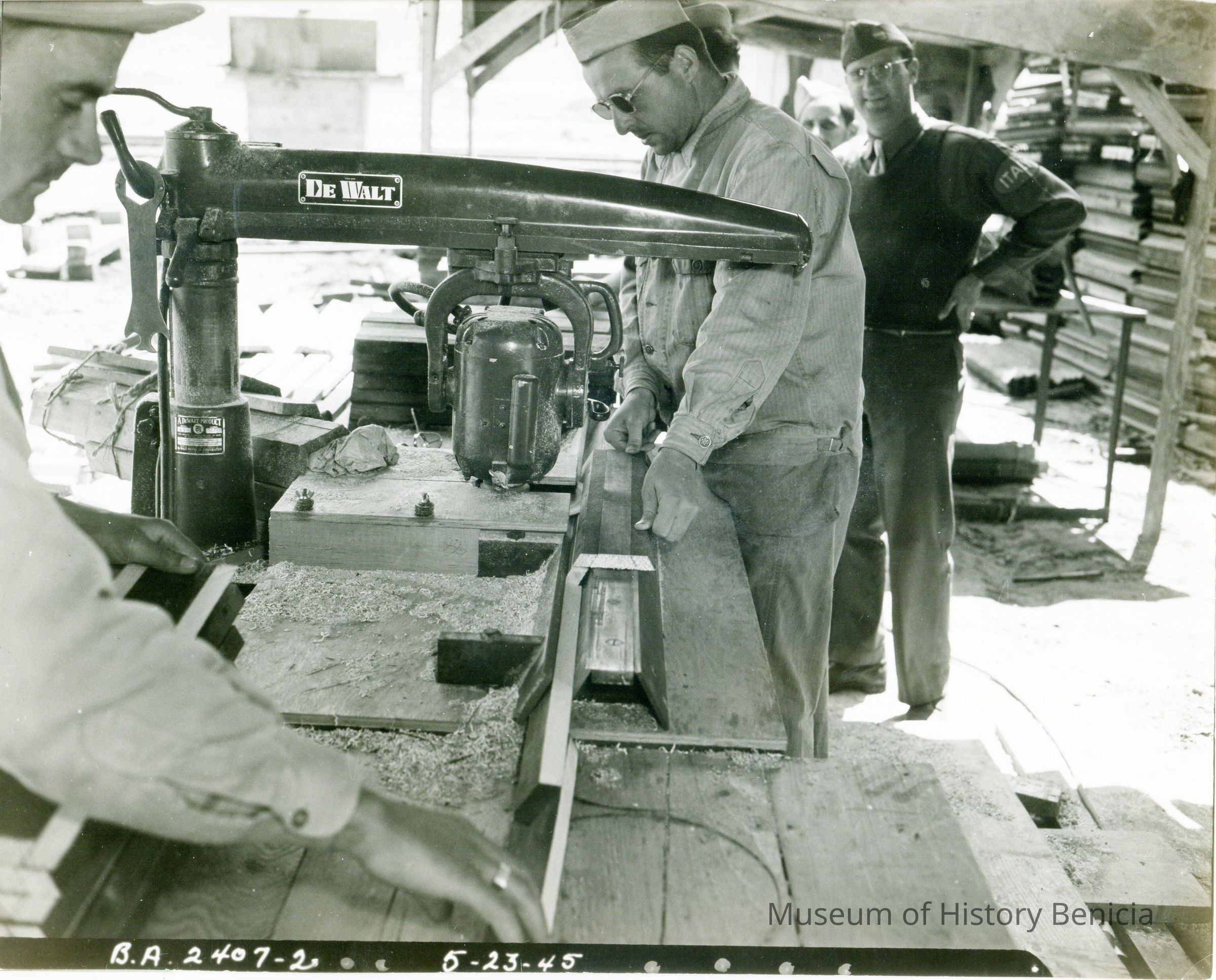 These are photos of the Benicia Arsenal at the time of WWII. They are copies of official Army photographs with the Benicia Arsenal number and date on most of them. This photo shows men sawing wood with a table saw while others are watching.Collection