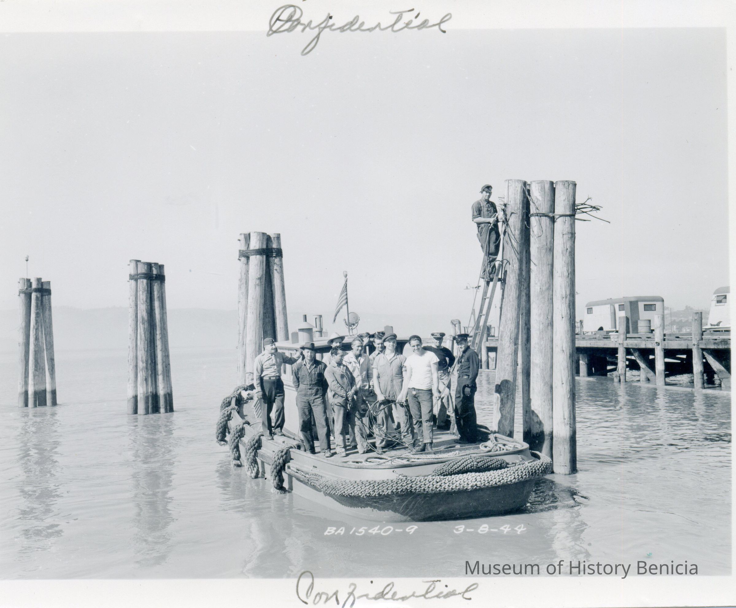 These are photos of the Benicia Arsenal at the time of WWII. They are copies of official Army photographs with the Benicia Arsenal number and date on most of them. This photo shows a policeman, army officer and Benicia Arsenal workers on a small tugboat.Collection