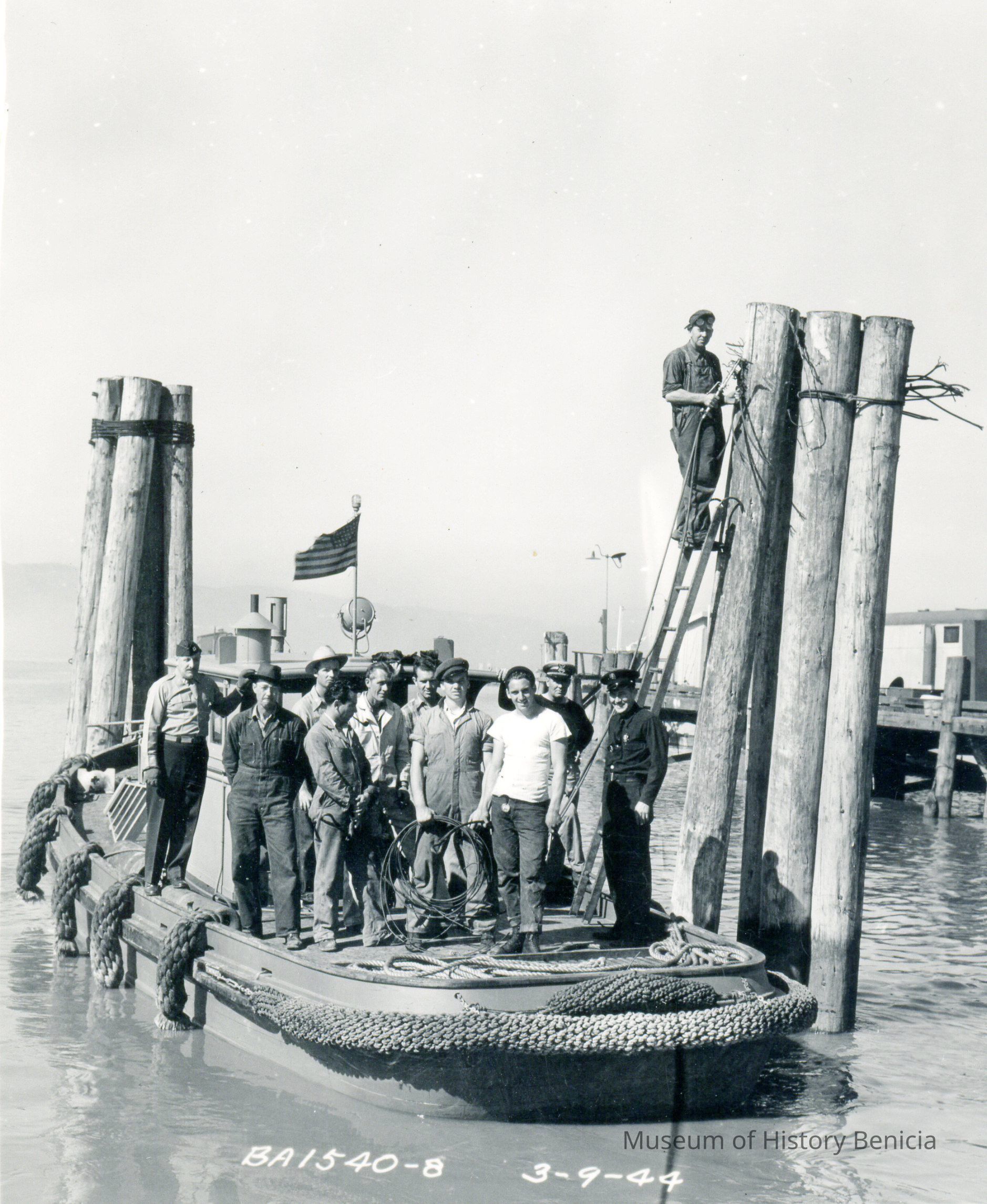 These are photos of the Benicia Arsenal at the time of WWII. They are copies of official Army photographs with the Benicia Arsenal number and date on most of them. This photo shows a policeman, army officer and Benicia Arsenal workers on a small tugboat. This is a duplicate of 2015.009.0180.Collection