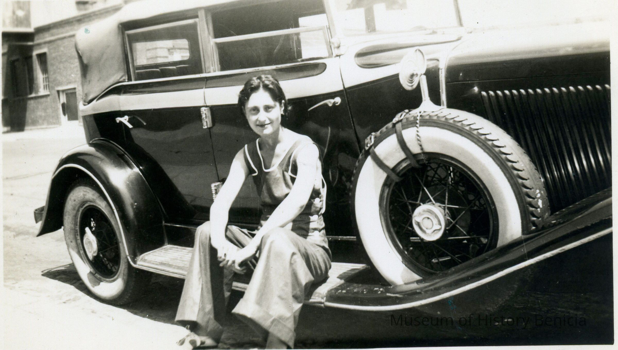 Woman sitting on the running board of an old car. This is a duplicate of 2015.009.0196.