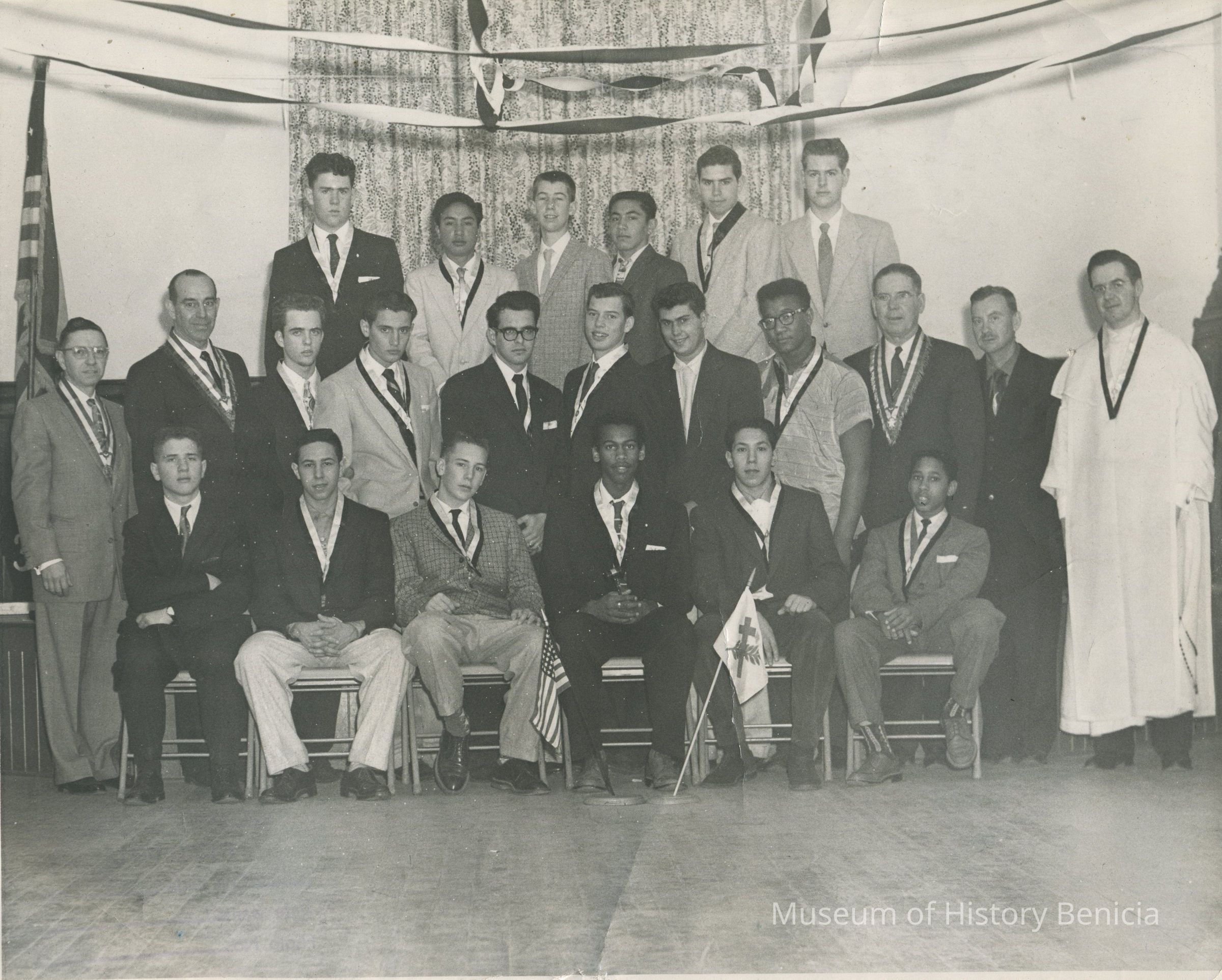 Standing Middle, L-R: unknown, unknown, Eddie Alameda, Ken Lewis, Bob Botti, unknown, John DaSilva, Jerry Miller, unknown, unknown, Father Horan;