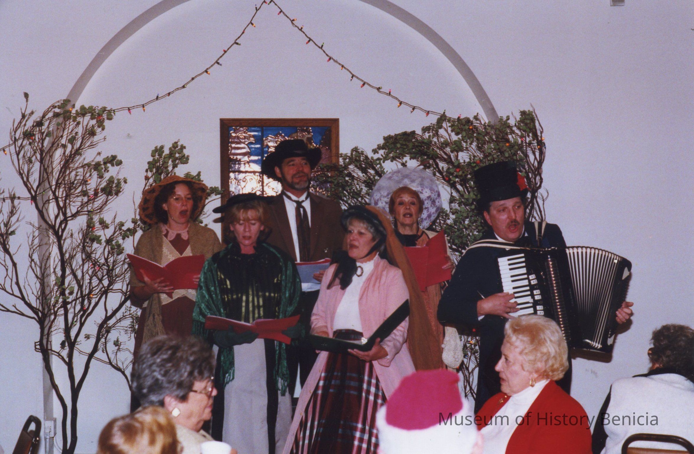 Color photograph of a Christmas Party at the Historical Museum in 1999 A choir is singing carols with accordion accompaniment.