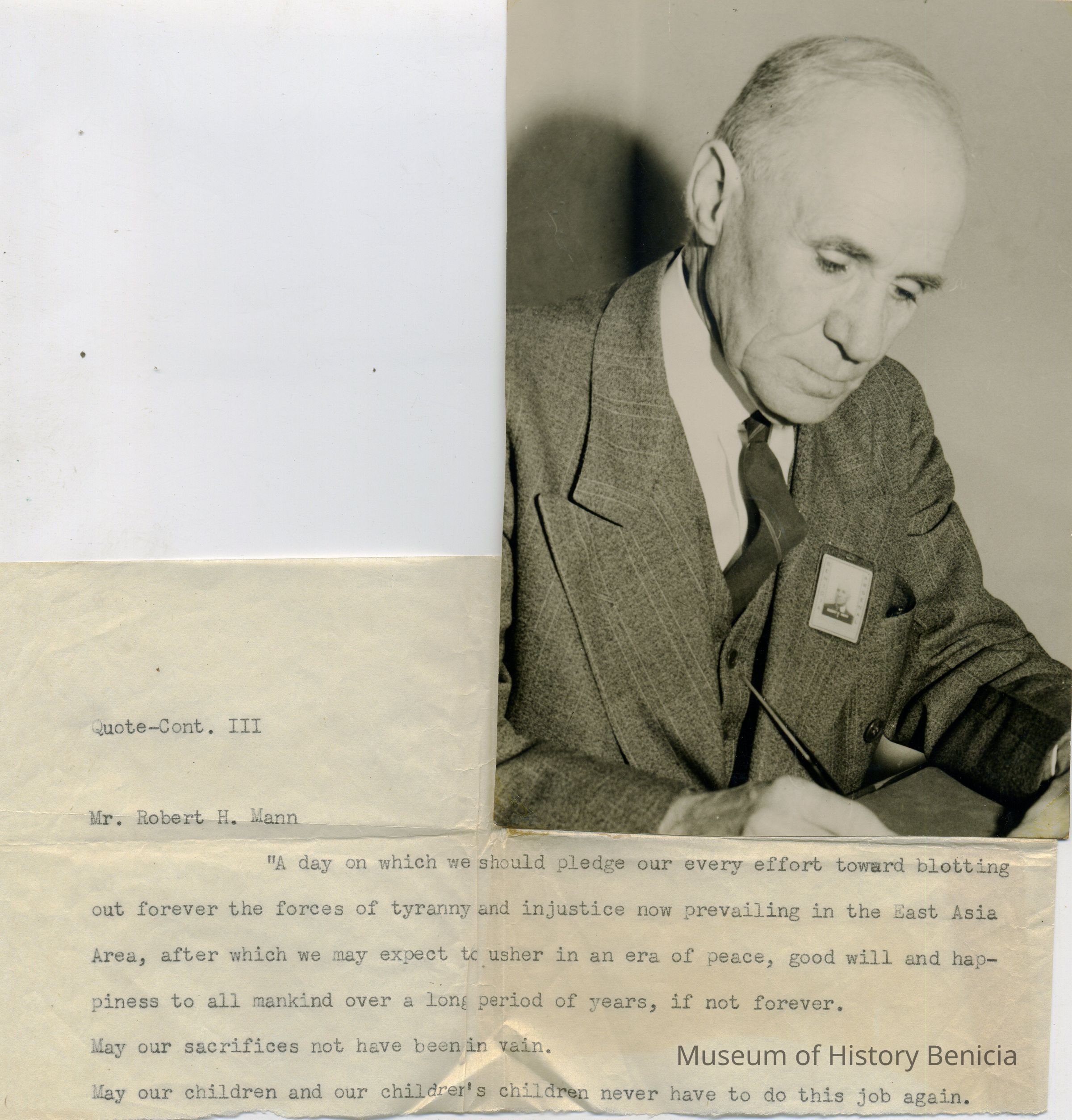 Photo of Robert H. Mann (chioef clerk at the Benicia Arsenal) and an attached quote of his regarding the effort to win World War II.Collection