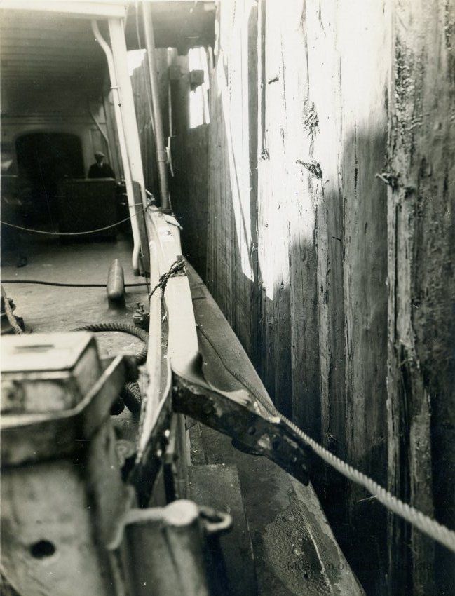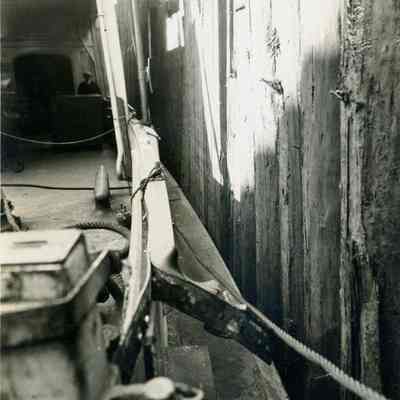 Photos taken to document the wreck of a ferry boat. The photos have a stamp on the back to identify the accident. Only the first photo (this photo) has information filled in to describe the accident. It says: