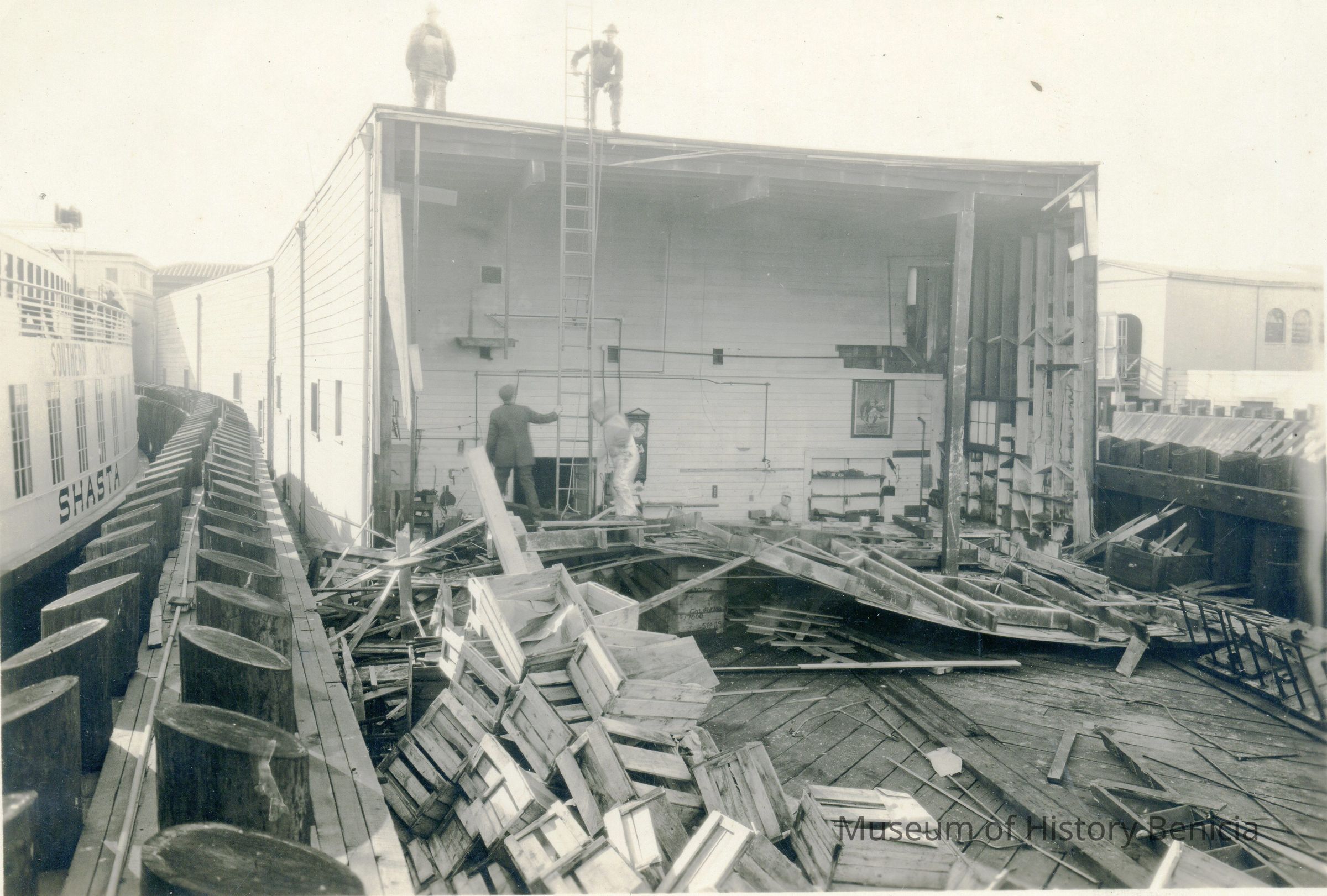Photos taken to document the dismantling of a ferry boat. The back has the date Dec 19/22./ This photo shows workers dismantling the deck.Collection