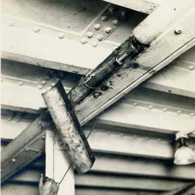 Photos taken to document the wreck of a ferry boat. This photo shows a close-up of a metal cover. The photos have a stamp on the back to identify the accident. Only the first photo has information filled in to describe the accident. It says: