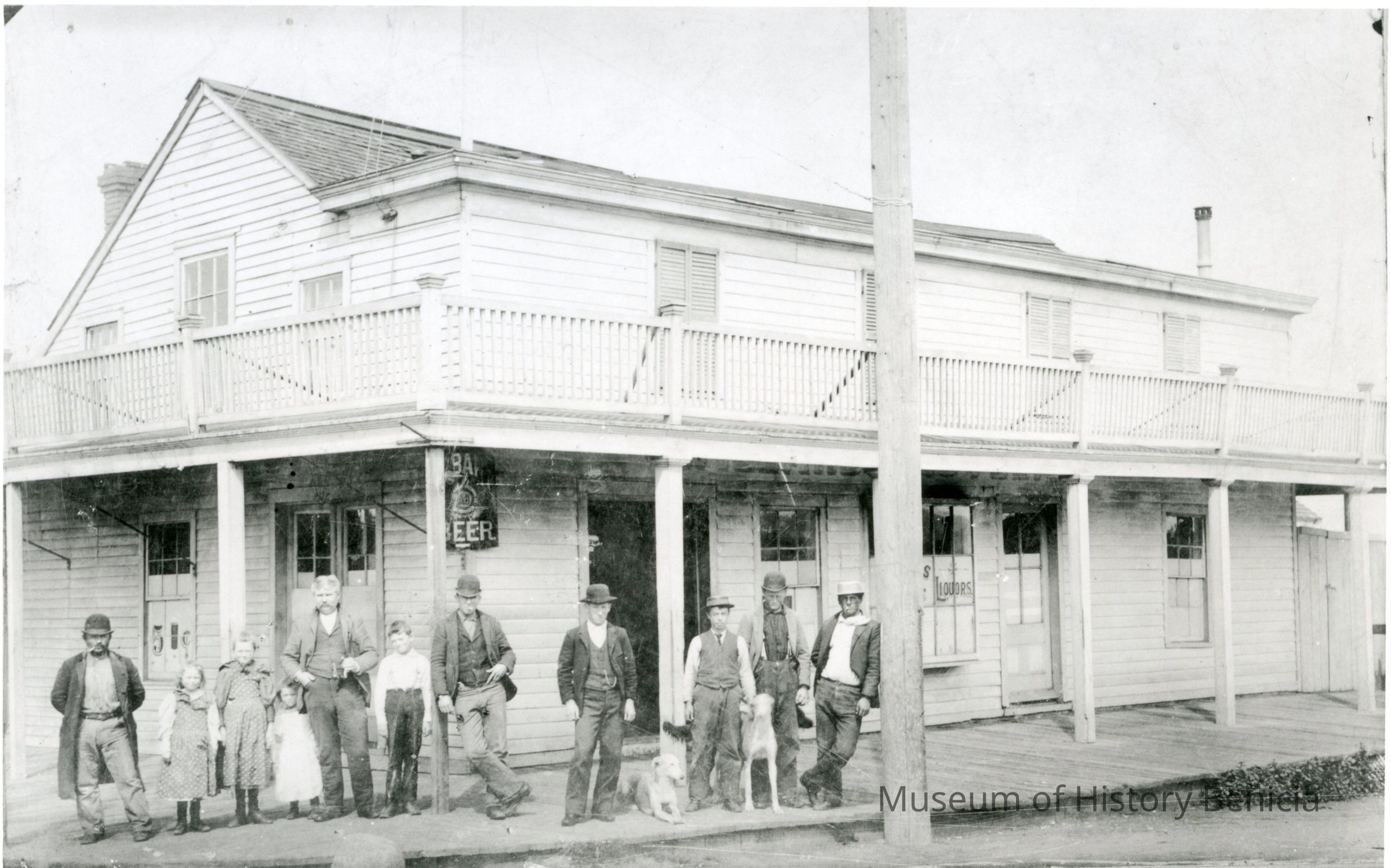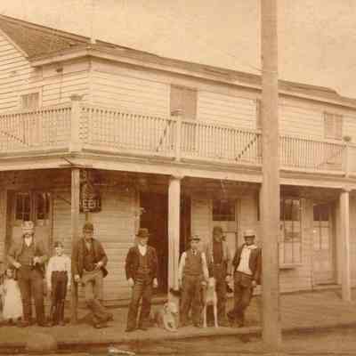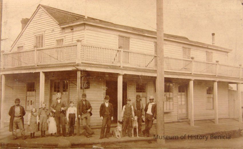 A copy of a photo from the California State Library Benicia collection. The photo shows Willard's Hotel with a group of people and dogs standing in front. The Willard Hotel was on the corner of First and A street in Benicia. It was very close to where the Jurgensen Saloon was later built. In fact, Jurgensen bought the 1 1/2 story hotel in 1889. He then either remodeled ther existing structure or built a new building on that spot circa 1902. The original owner was Joshua Willard but a later proprietor was Myrick Folsom.