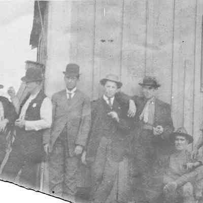 B/W photograph of a group of guys outside a building. The third man from the left seems to have a badge.