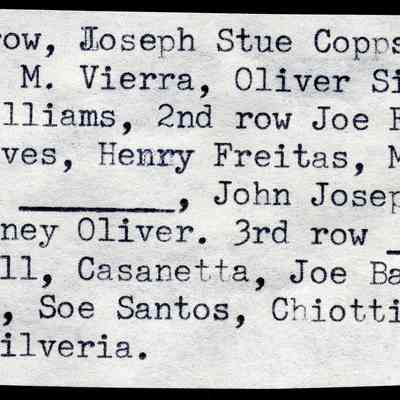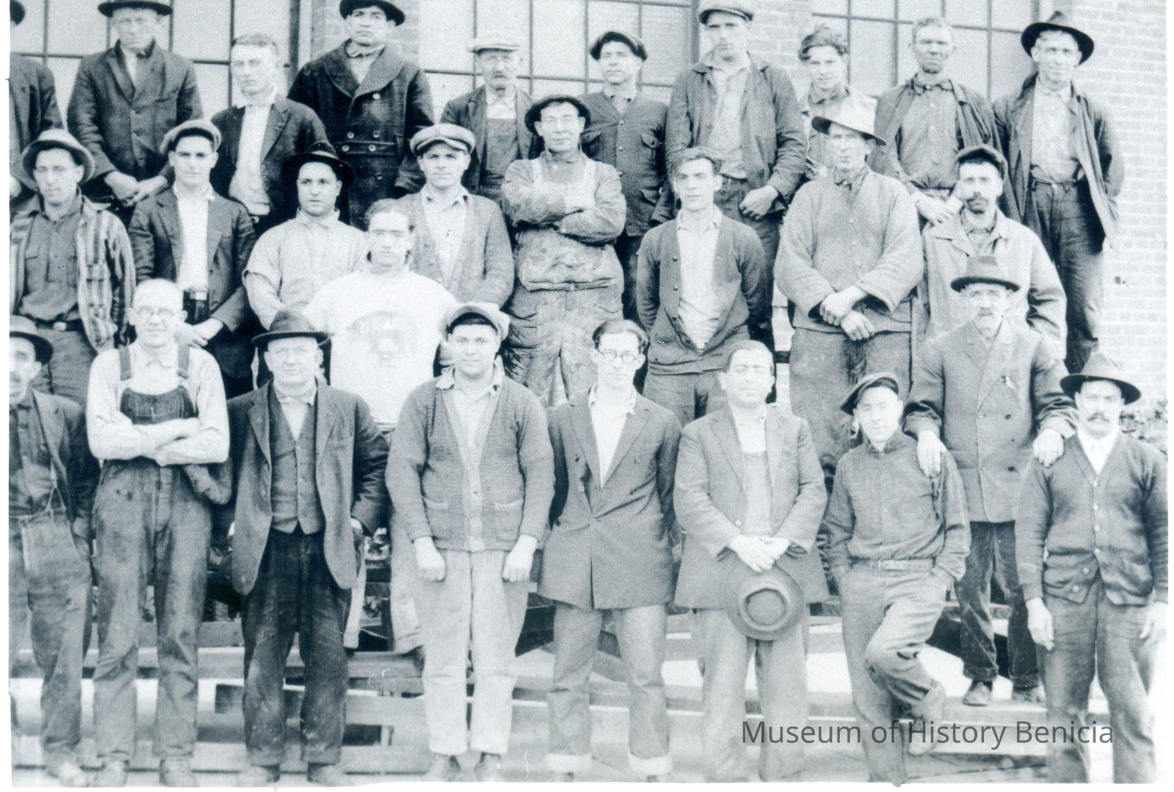 B/W photograph of McKay Tannery workers. This is part of a panoramic photo showing all of the workers at the tannery. Named are: