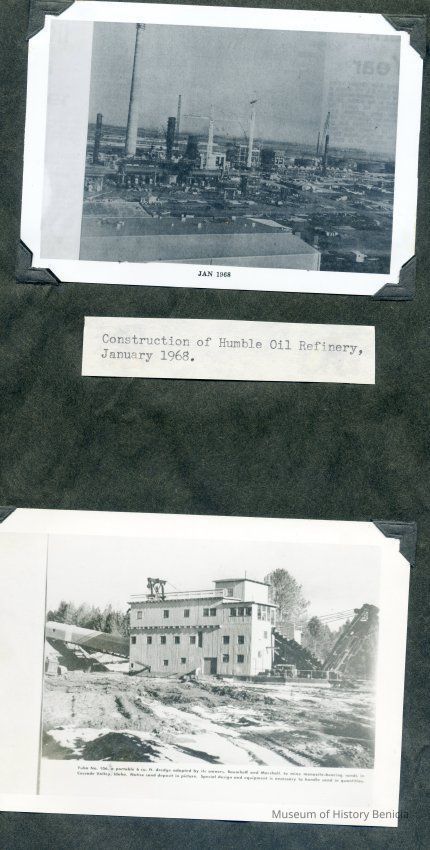B/W photograph of construction of Humble Oil Refinery and dredge in IdahoCollection