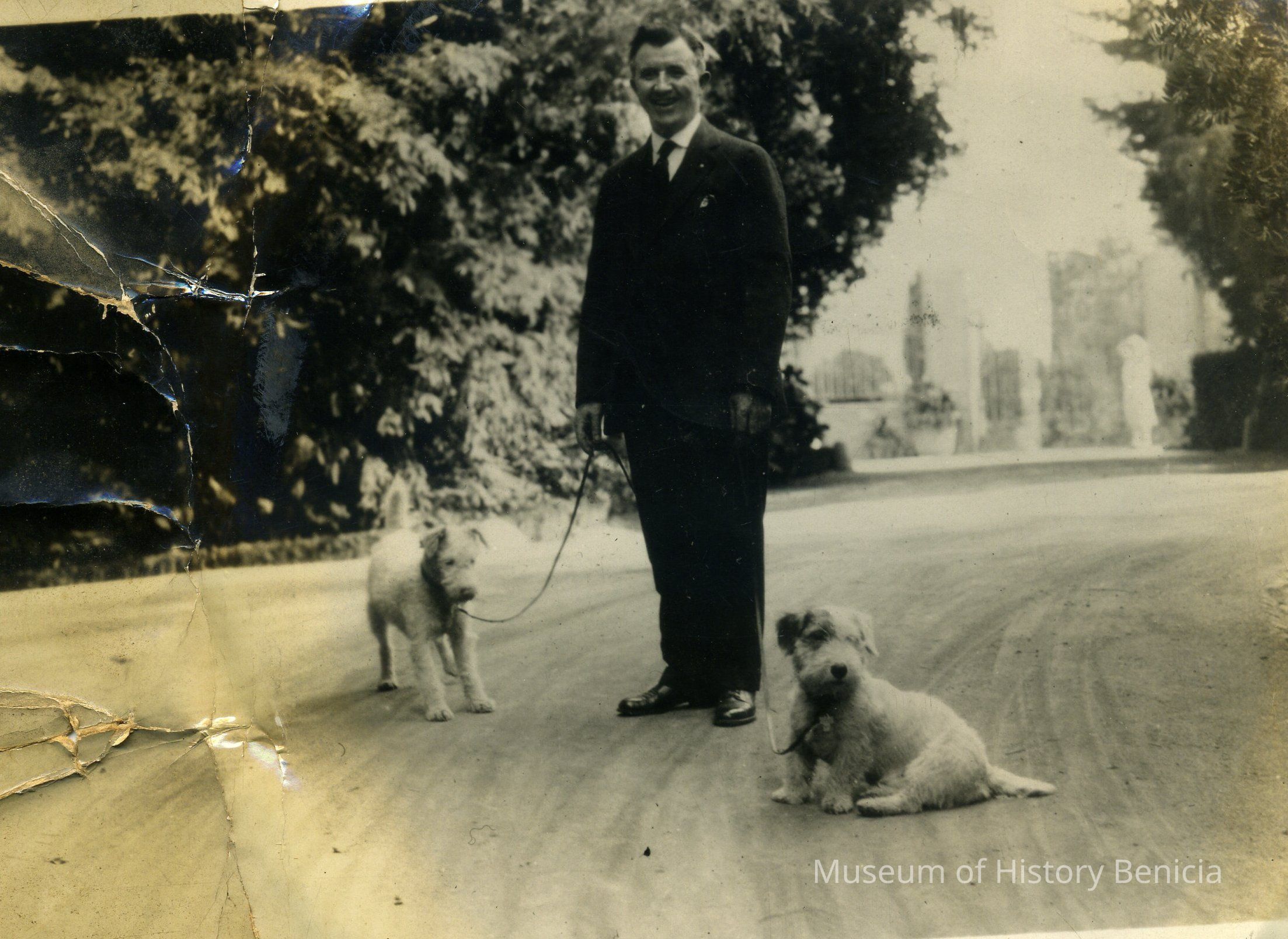 B/W photograph of an unidentified man with two dogs; 4-1/2" x 6-1/4"