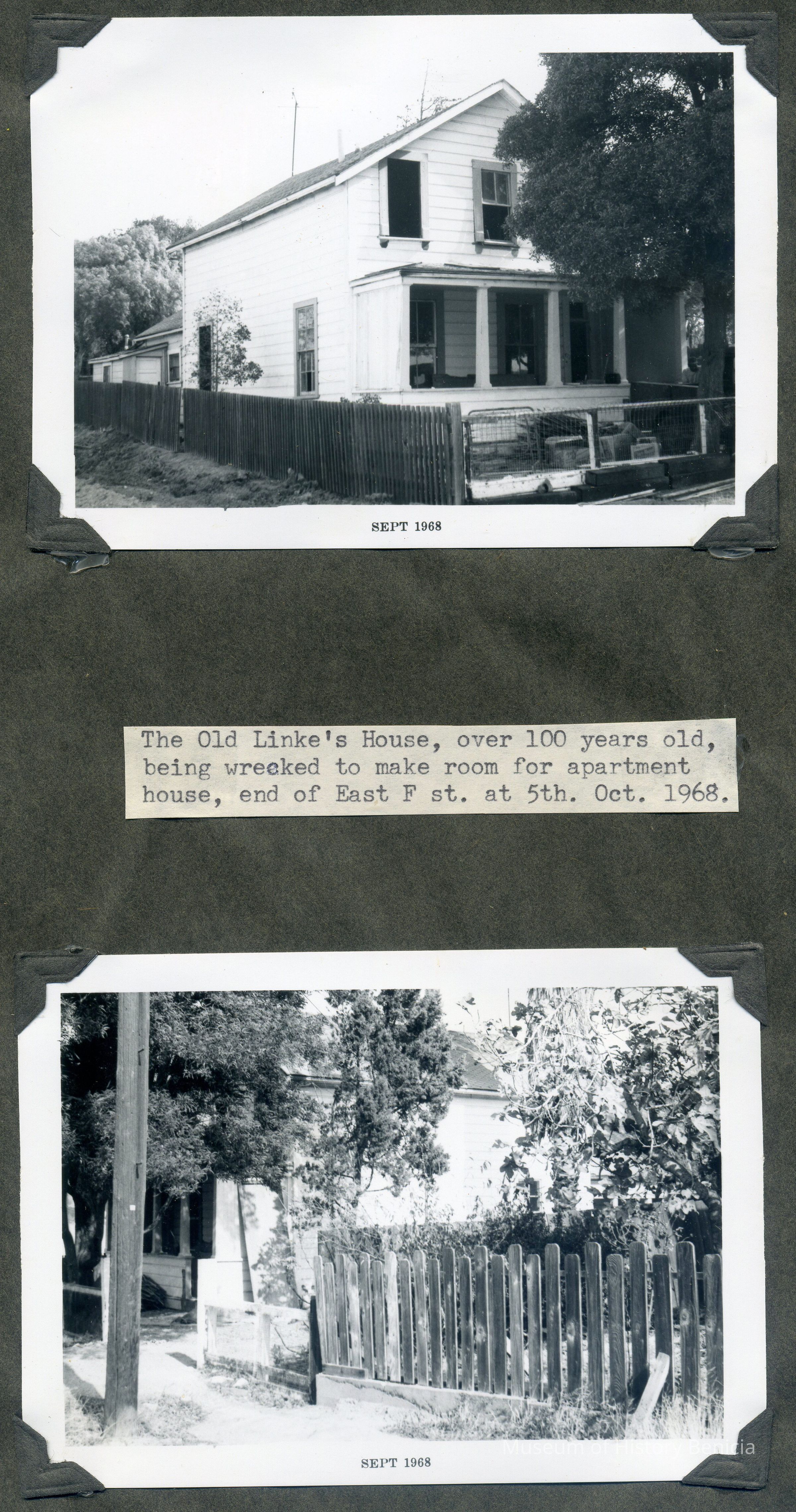 B/W photographs of the Old Linke's House, over 100 years old, being wrecked to make room for apartment house, end of East F. St. on October 5th, 1968.Collection
