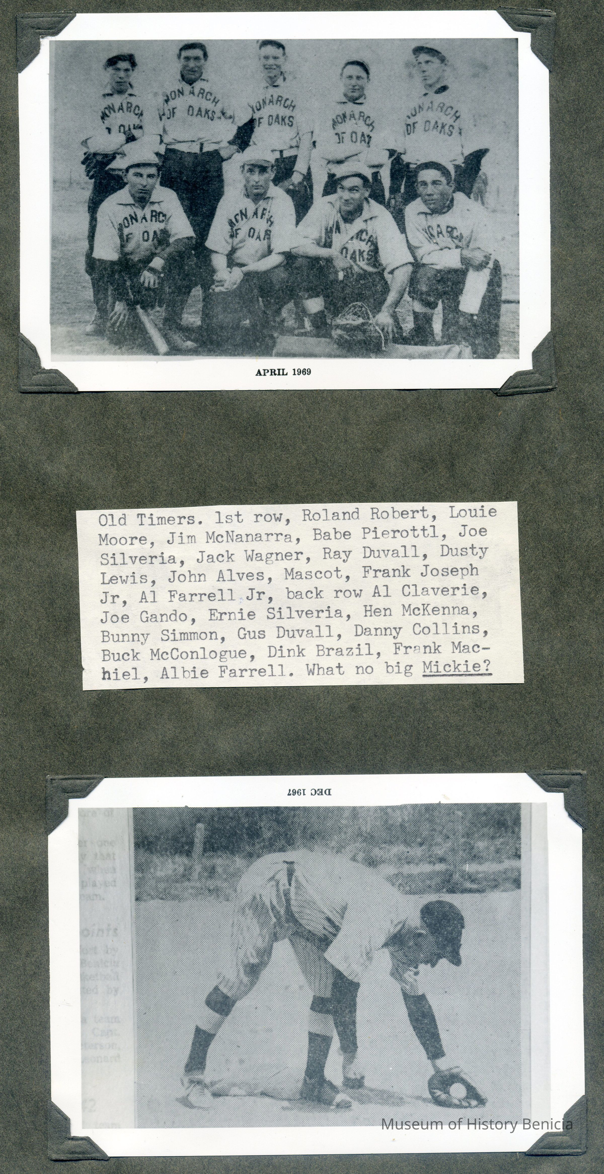 B/W photographs of the Old Timers. 1st row: Roland Robert, Louie Moore, Jim McNanarra, Babe Pierotti, Joe Silveria, Jack Wagner, Ray Duvall, Dusty Lewis, John Alves, Mascot, Frank Joseph Jr., Al Farrell Jr. Back row: Al Claverie, Joe Gando, Ernie Silveria, Hen McKenna, Bunny Simmon, Gus Duvall, Danny Collins, Buck McConlogue, Dink Brazil, Frank Machiel, Albie Farrell. What no big Mickie?Collection