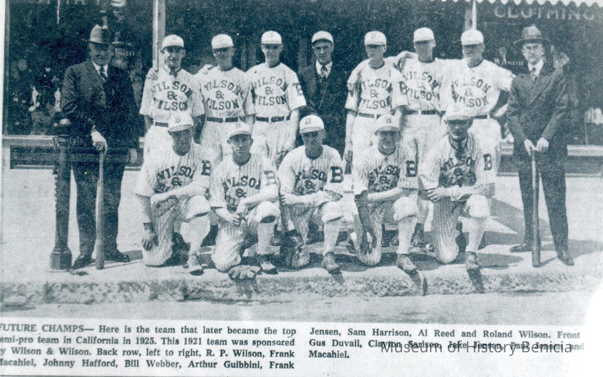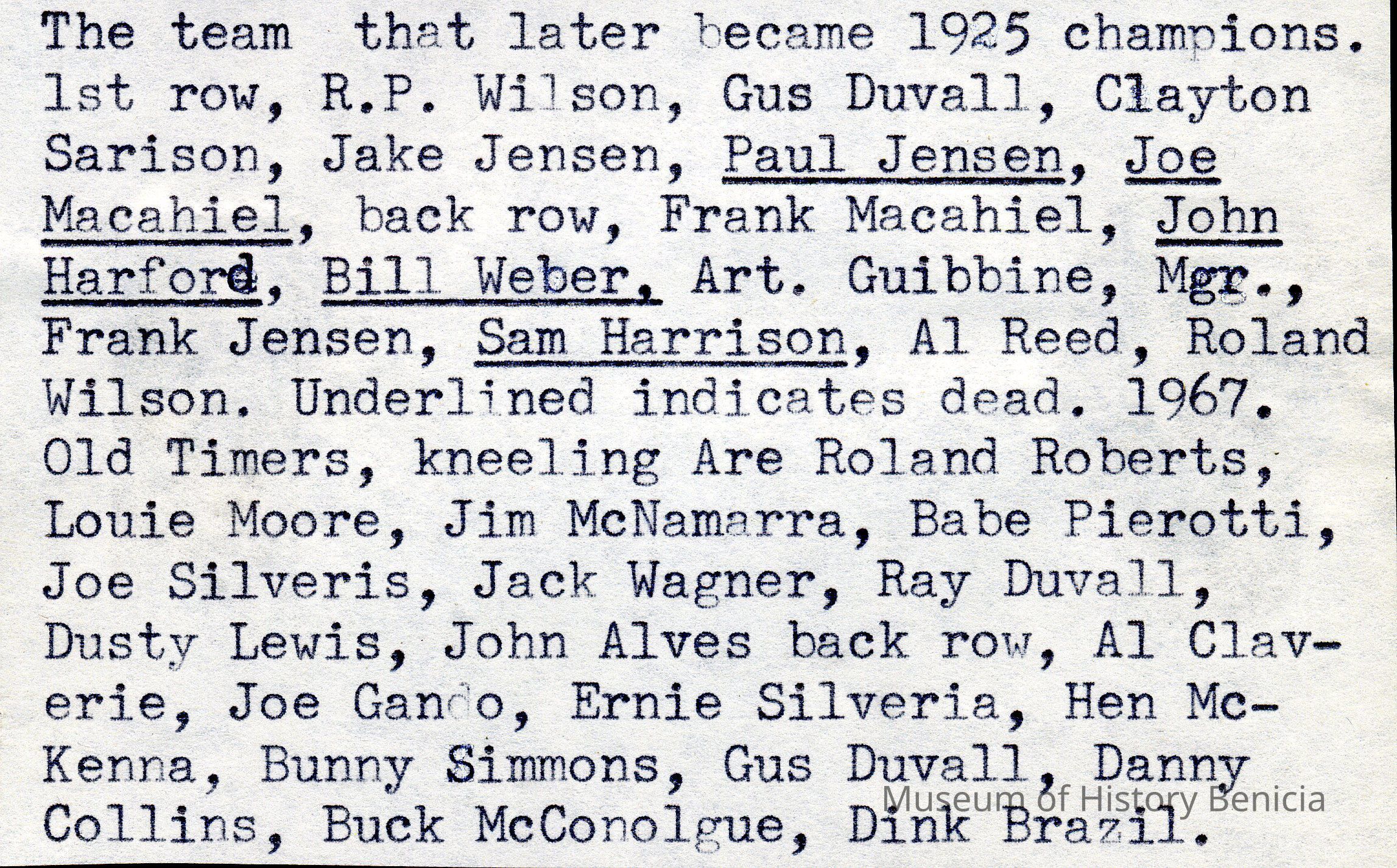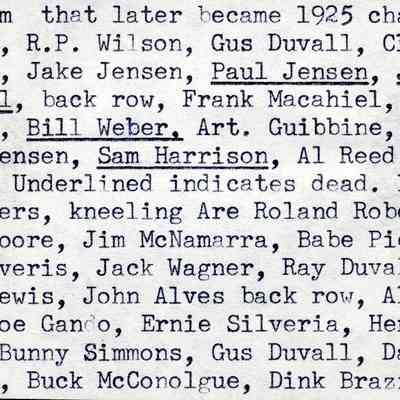 B/W photographs of the team that later became 1925 champions. 1st row: R.P. Wilson, Gus Duvall, Clayton Sarison, Jake Jensen, Paul Jensen, Joe Macahiel. Back row: Frank Macahiel, John Harford, Bill Weber, Art. Guibbine, Mgr., Frank Jensen, Sam Harrison, Al Reed, Roland Wilson.1967. Old Timers: kneeling are Roland Roberts, Louie Moore, Jim McNamarra, Babe Pierotti, Joe Silveris, Jack Wagner, Ray Duvall, Dusty Lewis, John Alves. Back row: Al Claverie, Joe Gando, Ernie Silveria, Hen McKenna, Bunny Simmons, Gus Duvall, Danny Collins, Buck McConolgue, Dink Brazil.Collection