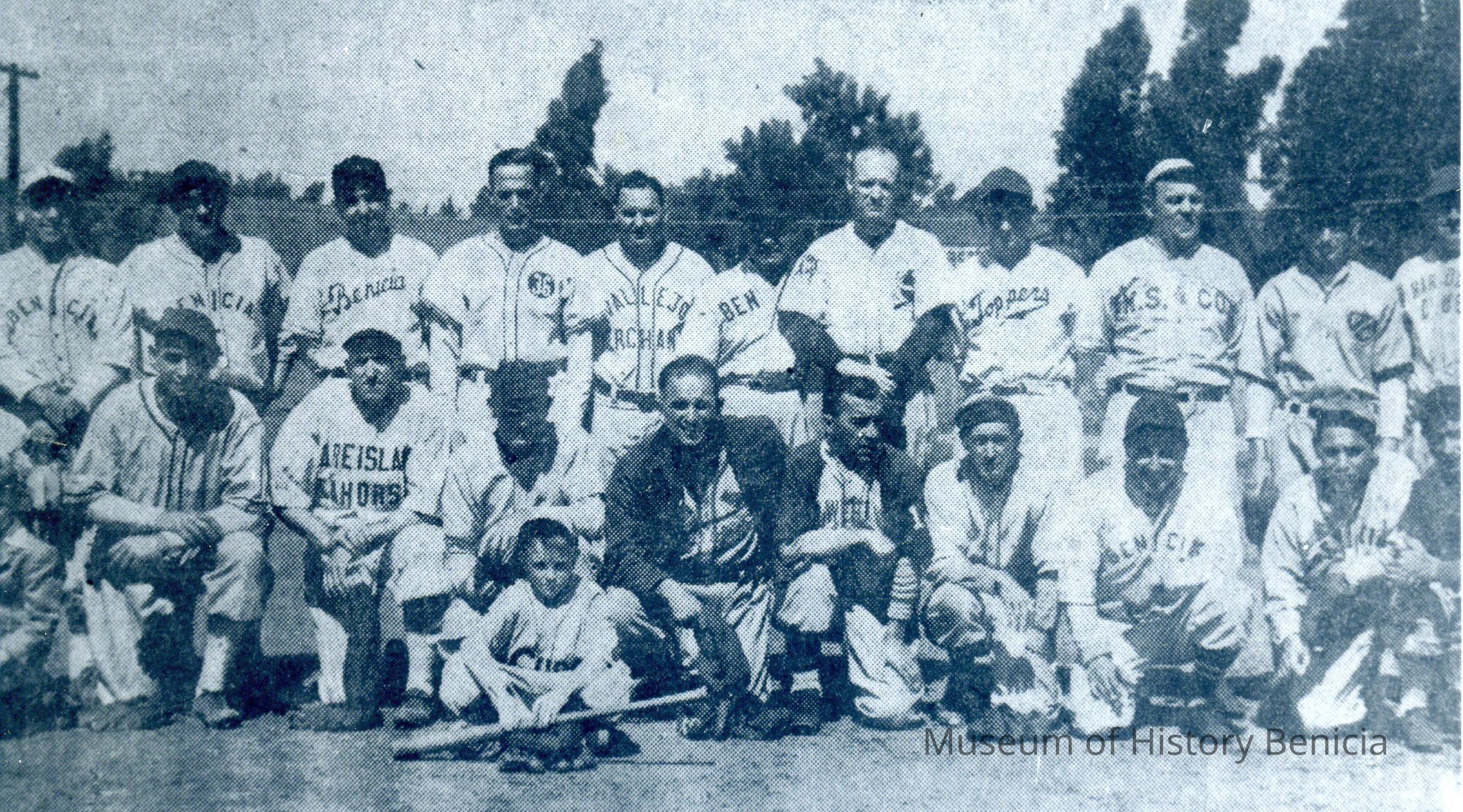 B/W photographs of the team that later became 1925 champions. 1st row: R.P. Wilson, Gus Duvall, Clayton Sarison, Jake Jensen, Paul Jensen, Joe Macahiel. Back row: Frank Macahiel, John Harford, Bill Weber, Art. Guibbine, Mgr., Frank Jensen, Sam Harrison, Al Reed, Roland Wilson.1967. Old Timers: kneeling are Roland Roberts, Louie Moore, Jim McNamarra, Babe Pierotti, Joe Silveris, Jack Wagner, Ray Duvall, Dusty Lewis, John Alves. Back row: Al Claverie, Joe Gando, Ernie Silveria, Hen McKenna, Bunny Simmons, Gus Duvall, Danny Collins, Buck McConolgue, Dink Brazil.Collection