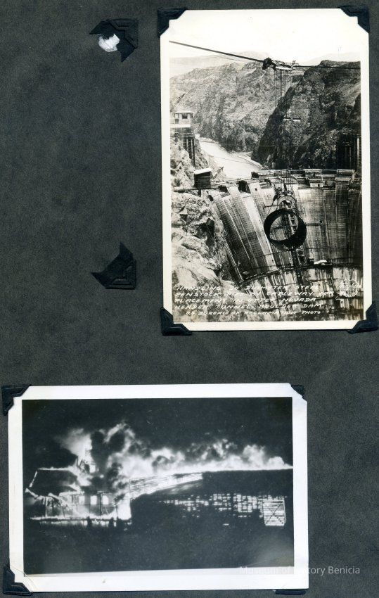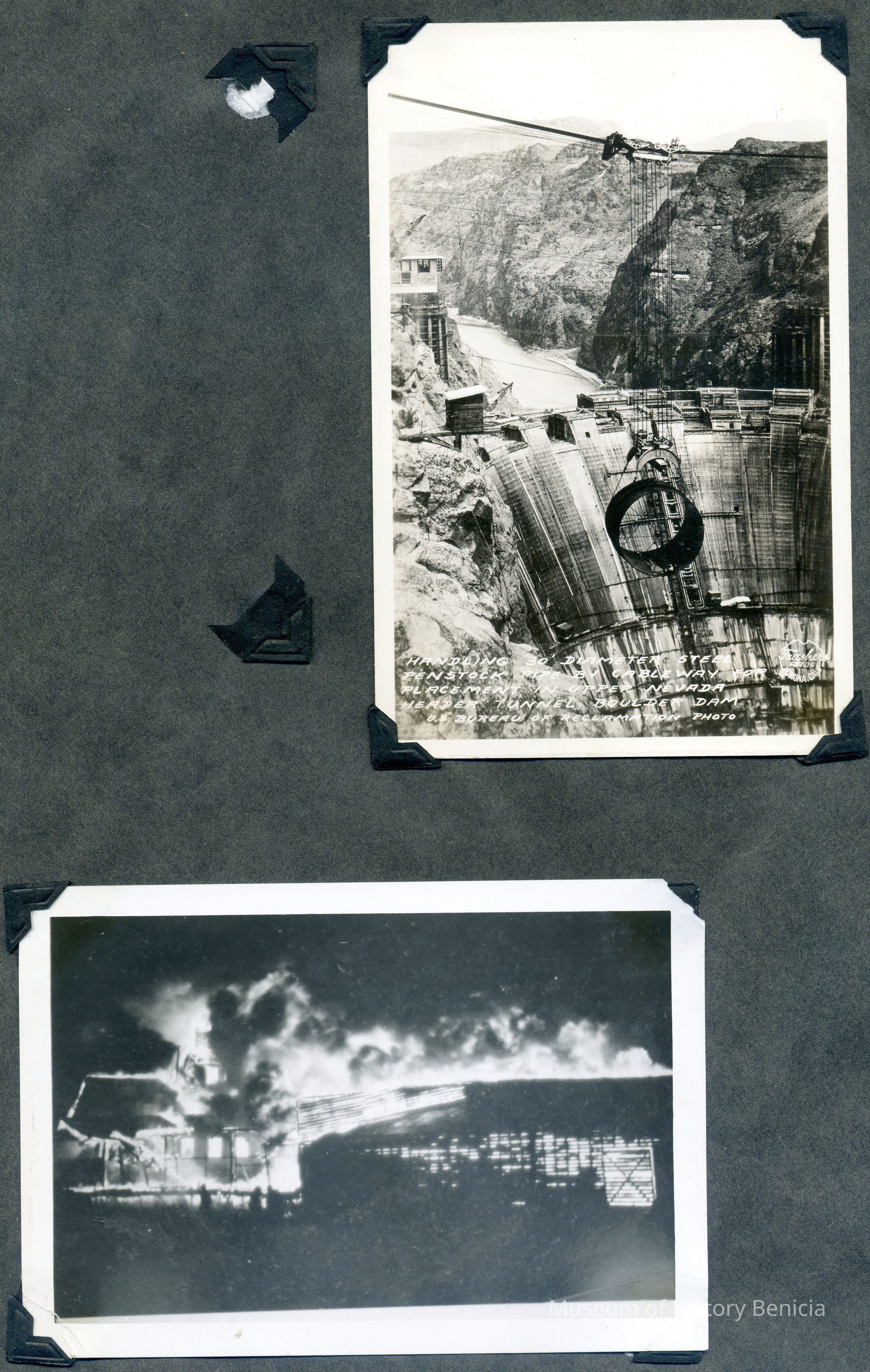 B/W photographs of Boulder Dam and a building fire.Collection