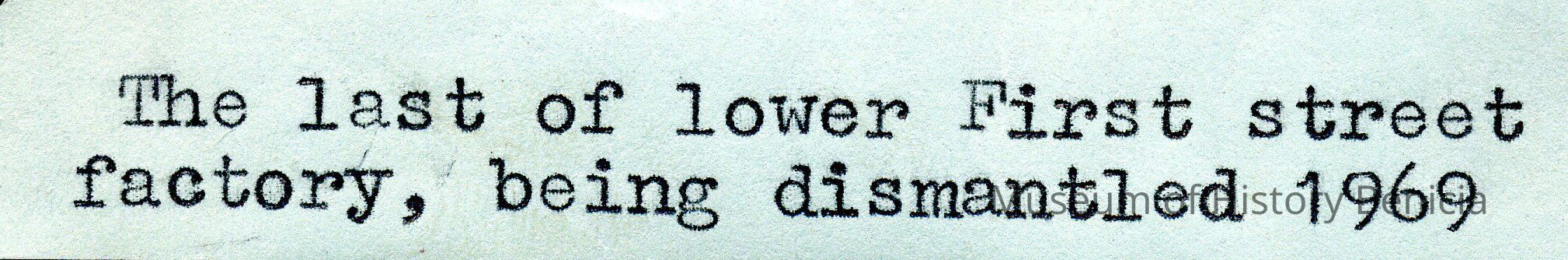 B/W photograph of the last of lower First Street factory, being dismantled 1969.Collection