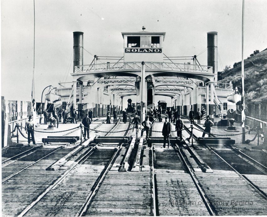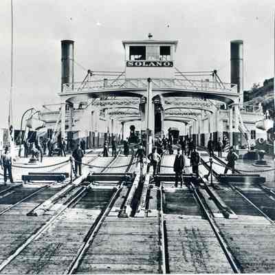 Photo of the ferry boat Solano at dock with crew and passengers standing on the bow. This looks like a copy of an early photo. There are trains in the background. The back of the photo has a sticker saying this is a Southern Pacific photo.Collection