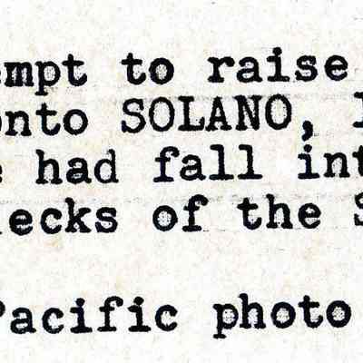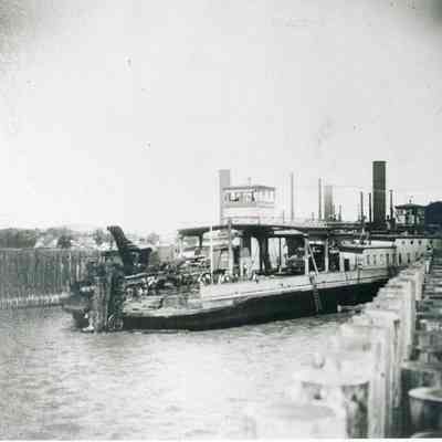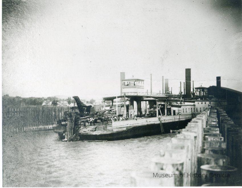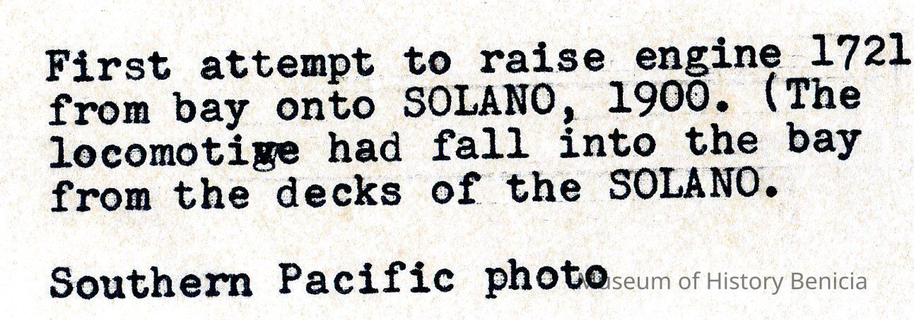 Photo of the ferry boat Solano at dock. This is a copy of an old photo showing the raising of engine # 1721 from the Bay in 1900. The sticker on the back describes the scene and identifies the photo as coming from the Southern Pacific.Collection